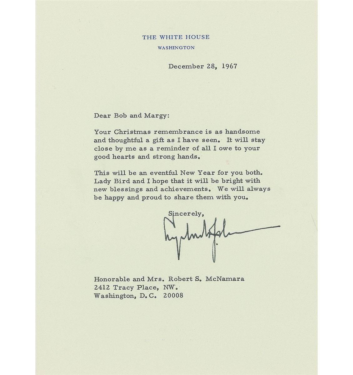 Tls, as president, one page, 6.75 x 8.75, White House letterhead, December 28, 1967. Letter to Secretary of Defense Robert McNamara and his wife. In full: “Your Christmas remembrance is as handsome and thoughtful a gift as I have seen. It will stay close by me as a reminder of all I owe to your good hearts and strong hands. This will be an eventful New Year for you both. Lady Bird and I hope that it will be bright with new blessings and achievements. We will always be happy and proud to share them with you.” In fine condition.