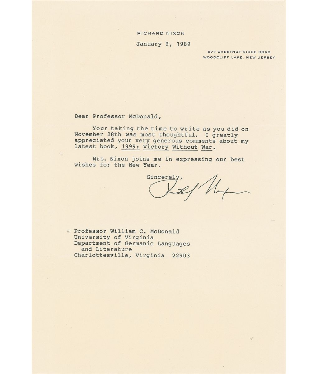 TLS, one page, 6.25 x 6, personal letterhead, January 9, 1989. Letter of thanks to an admirer reads, in part: “Your taking the time to write as you did on November 28th was most thoughtful. I greatly appreciated your very generous comments about my latest book, 1999: Victory Without War.” In fine condition.