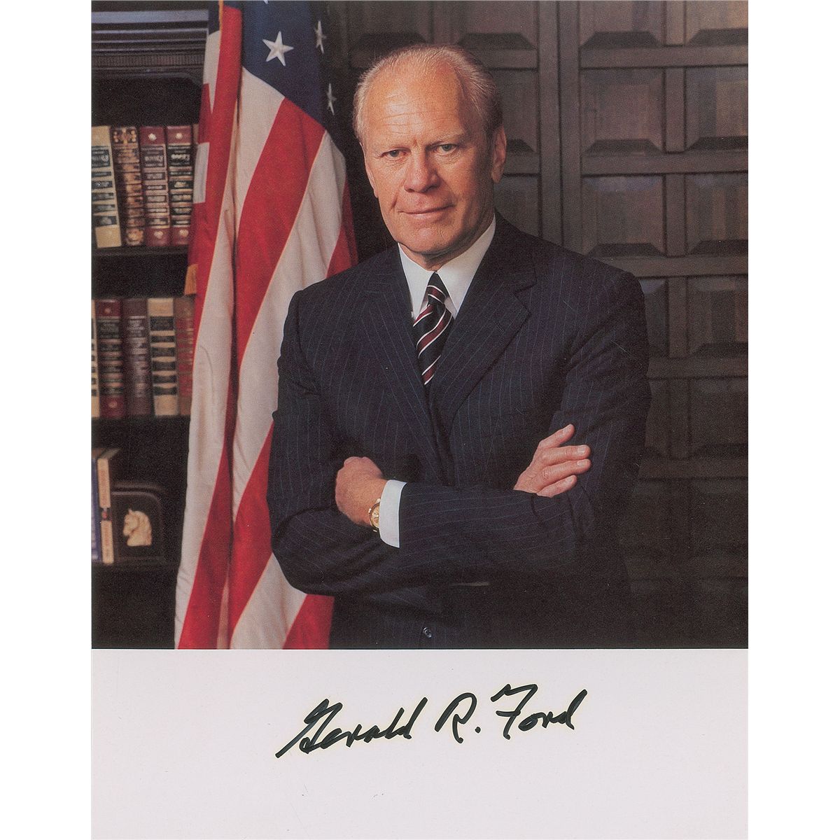 Color 8 x 10 paperstock photo, signed in the lower border in black felt tip, “Gerald R. Ford.” Light overall haloing to signature, otherwise fine condition.
