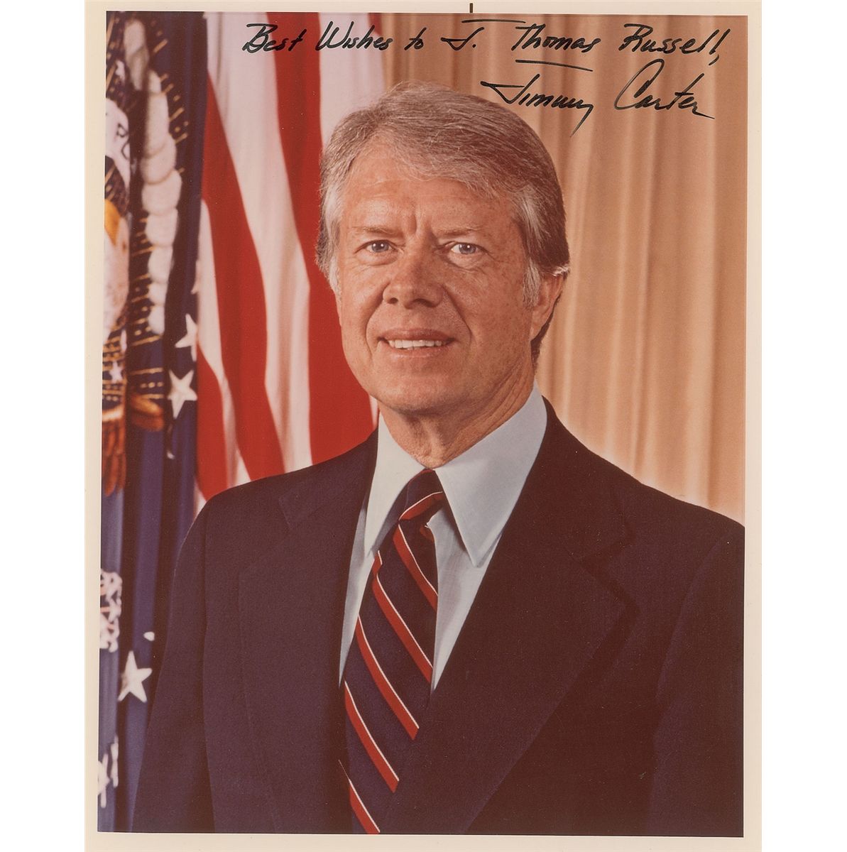 Color satin-finish 8 x 10 photo, signed and inscribed in black felt tip, “Best wishes to J. Thomas Russell, Jimmy Carter.” In fine condition.