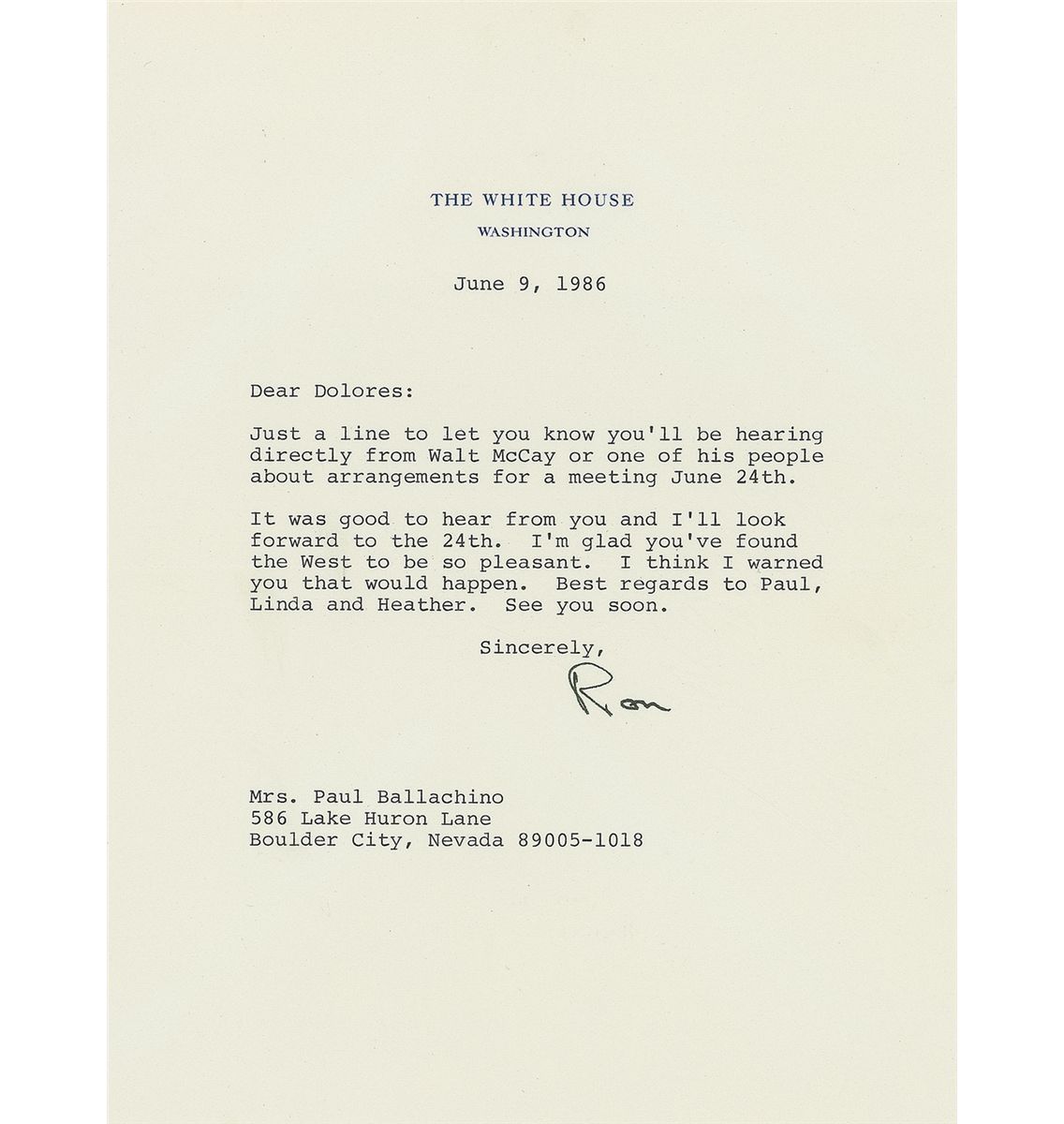 TLS, as president, signed “Ron,” one page, 6.5 x 9, White House letterhead, June 9, 1986. Letter to Mrs. Paul Ballachino. In full: “Just a line to let you know you’ll be hearing directly from Walt McCay or one of his people about arrangements for a meeting June 24th. It was good to hear from you and I’ll look forward to the 24th. I’m glad you’ve found the West to be so pleasant. I think I warned you that would happen. Best regards to Paul, Linda and Heather. See you soon.” In fine condition. Accompanied by the original mailing envelope.