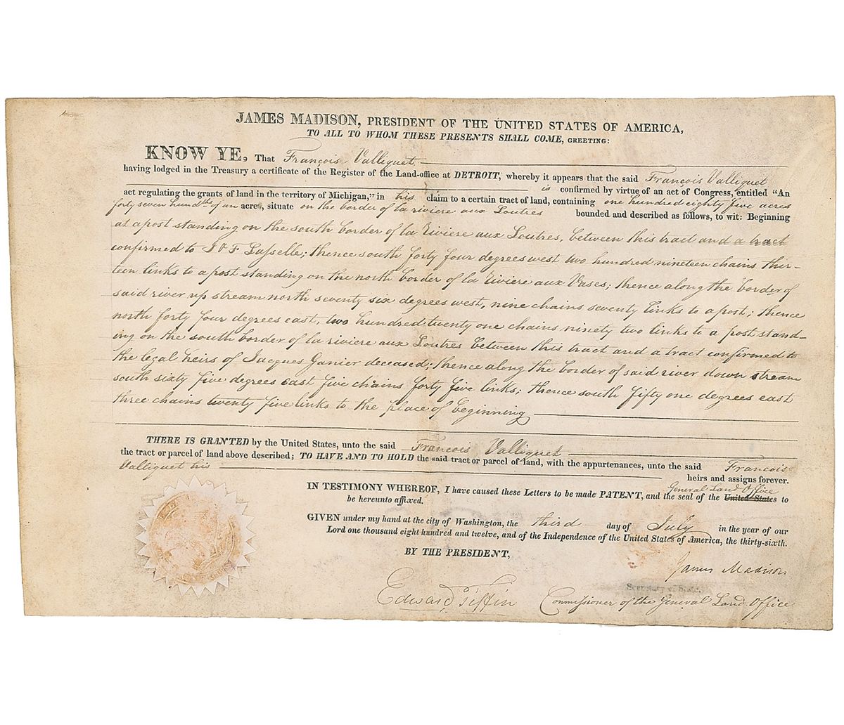 Partly-printed DS, as president, one page, 15.25 x 10, July 3, 1812. President Madison grants Francois Valliquet 185 acres of land in Michigan, with the document providing a detailed description of the borders. Signed at the conclusion by Madison and countersigned by Commissioner of the General Land Office Edward Tiffin. In very good to fine condition, with intersecting folds, some light toning over beginning of signature from seal, and some scattered toning. The seal is toned, but intact.