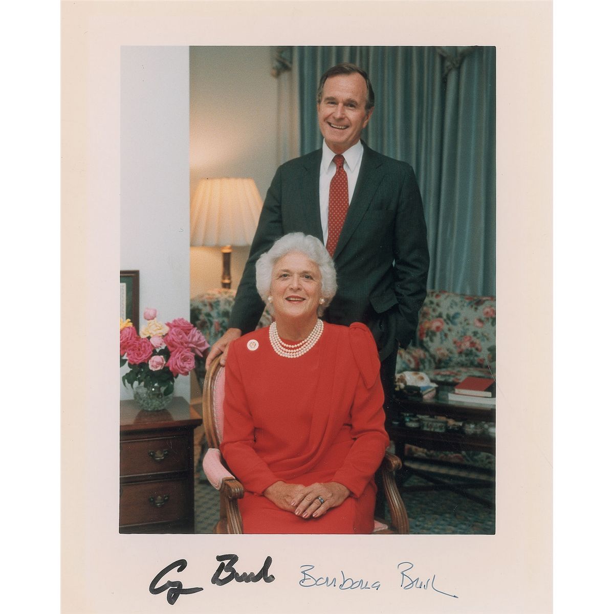 Color satin-finish 8 x 10 photo of George and Barbara Bush in the White House, signed in the lower border in black felt tip, “George Bush,” and “Barbara Bush.” In fine condition.