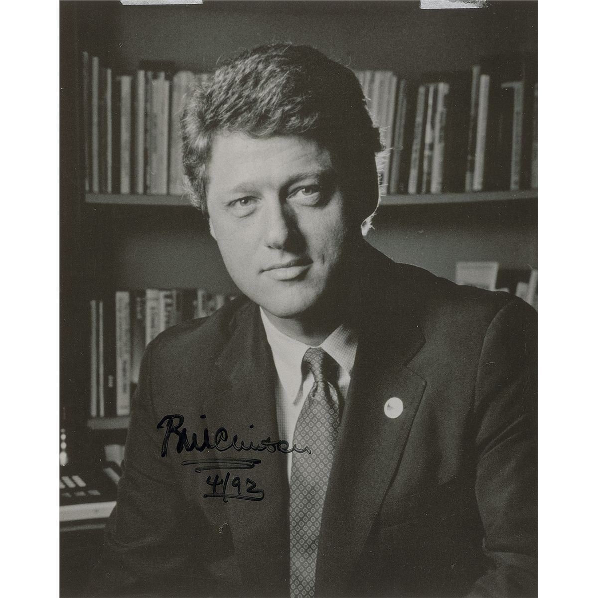 Glossy 8 x 10 photo, signed in black felt tip, “Bill Clinton, 4/92.” In fine condition.
