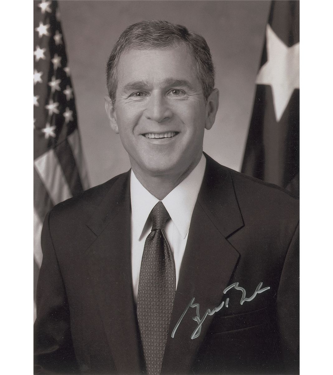 Satin-finish 5 x 7 photo of Bush posing between the American and Texan flags, signed in silver ink. Matted and framed to an overall size of 9.25 x 11. In very fine condition.