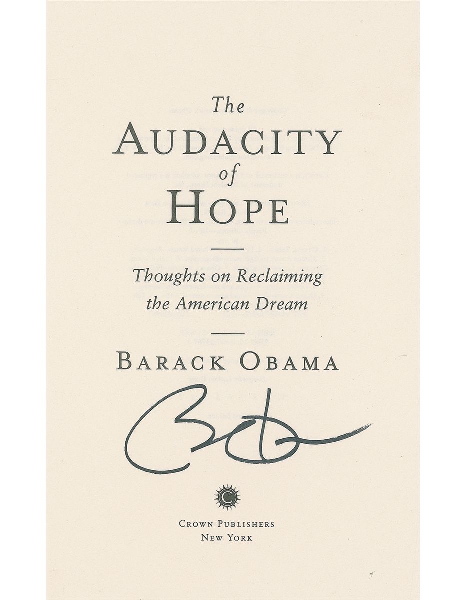 Title page from The Audacity of Hope, 5.5 x 9, signed near the bottom in black felt tip. In fine condition.