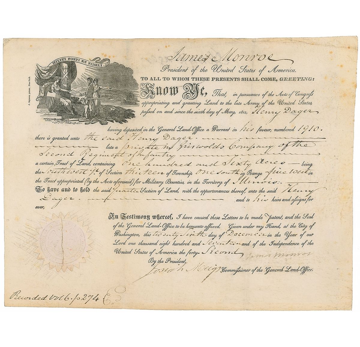 Partly-printed DS, as president, one page, 13 x 10, December 26, 1817. Land grant issued to Henry Dager “late a private in Griswolds Company of the Second Regiment of Infantry,” 160 acres of land in the Illinois Territory for his military service. Signed at the conclusion by Monroe and countersigned by Commissioner of the General Land Office Josiah Meigs. In very good condition, with intersecting folds, a bit of light rubbing over signature, and some light toning and soiling. The seal is intact with a central vertical crease.