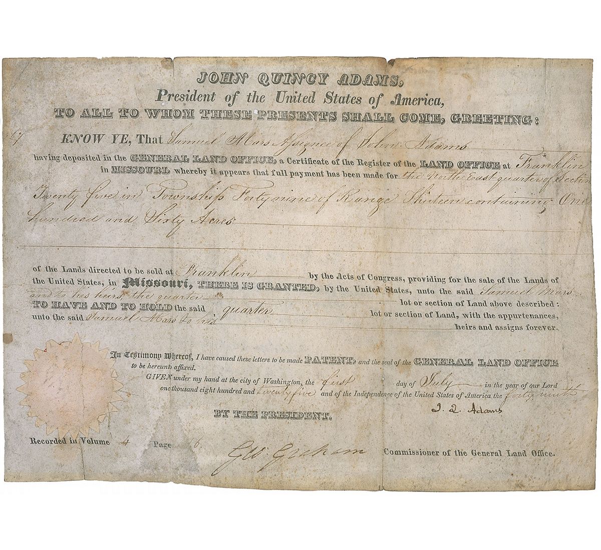 Partly-printed DS, signed as president, “J. Q. Adams,” one page, 12.25 x 9, July 1, 1825. President Adams grants Samuel Mars, assignee of John Adams, 160 acres of land in Missouri. Signed at the conclusion by Adams and countersigned by Commissioner of the General Land Office George Graham. In very good condition, with intersecting folds and scattered soiling. The seal is worn and creased, but intact, and Adams’s signature remains quite bold.