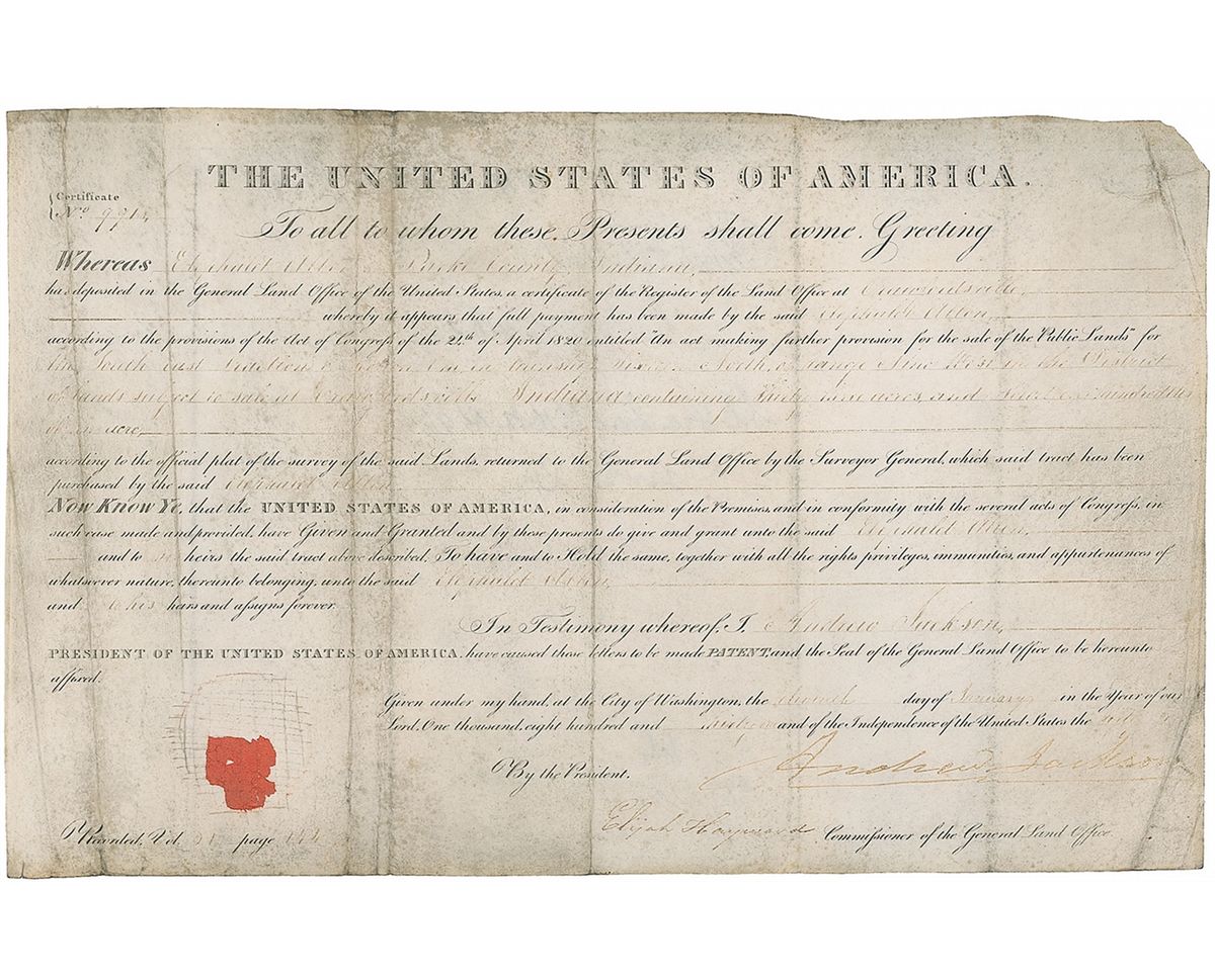Partly-printed DS, signed as president, one page, 15.25 x 9.75, January 10, 1830. President Jackson grants an Indiana man almost 40 acres of land. Signed at the conclusion by Jackson and countersigned by Commissioner of the General Land Office Elijah Hayward. In very good condition, with Jackson’s signature and most of the handwritten text of the document light, but still mostly legible, intersecting folds, and some light soiling. The seal is missing.