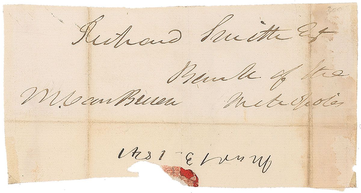 Hand-addressed free-franked mailing panel, 5.25 x 2.5, addressed in Van Buren’s hand to, “Rutland Smith, Esq., Bank of the Metropolis,” and franked in the lower left, “M. Van Buren.” Two vertical folds, one through a single letter of signature, a bit of toning along folds, and some light dampstaining to right edge, otherwise fine condition.