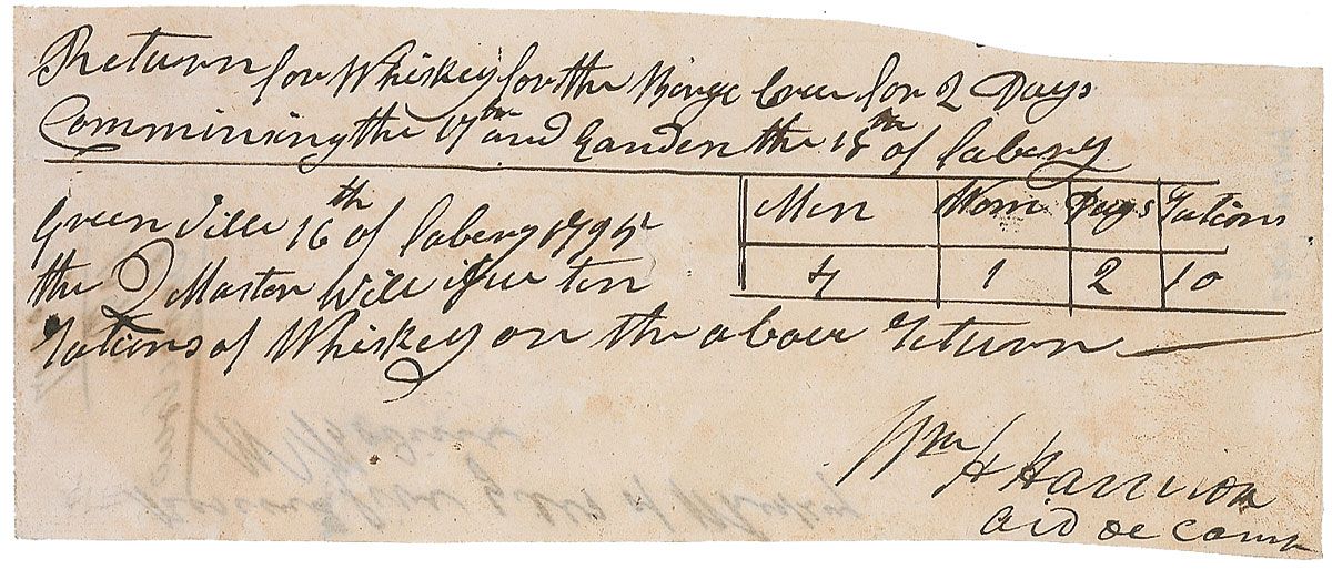 Manuscript DS, signed “Wm. H. Harrison, Aid de Camp,” one page, 7.75 x 3, February 16, 1795. Harrison, as aide-de-camp to General ‘Mad’ Anthony Wayne, approves ten whiskey rations for a five-person barge crew for two days. Some scattered mild toning, as well as some show-through from notations on reverse, otherwise fine condition.