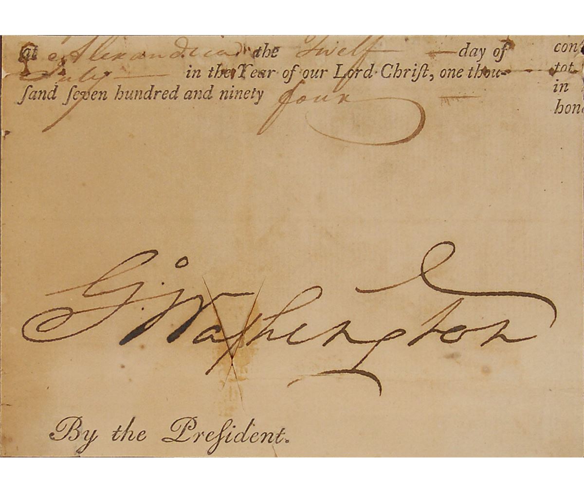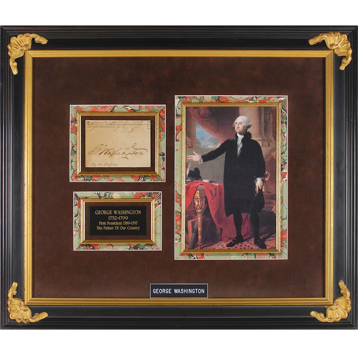 Bold ink signature as president, "G:o Washington," on an off-white 4.25 x 3.25 slip clipped from a larger document. Handsomely mounted, double-matted, and ornately framed with a color portrait, engraved plaque, and nameplate affixed to the glass to an overall size of 24.5 x 21. In very good condition, with subtle intersecting folds, overall toning, and two cancellation slits cut through the "s" in his last name. A highly appealing example of Washington's sought-after presidential autograph.