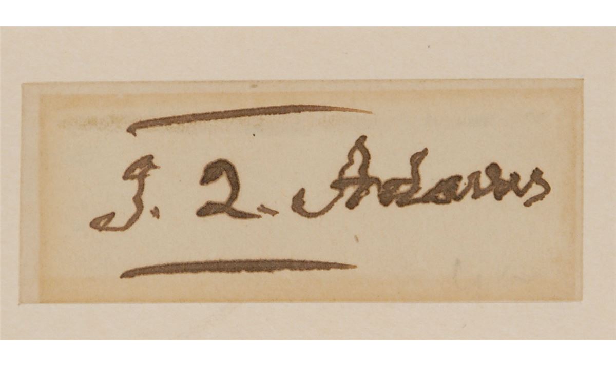 Bold ink signature, "J. Q. Adams," on an off-white 2 x .75 slip. Double-matted with a color portrait bearing a facsimile signature and a nameplate to an overall size of 11 x 18. In fine condition.