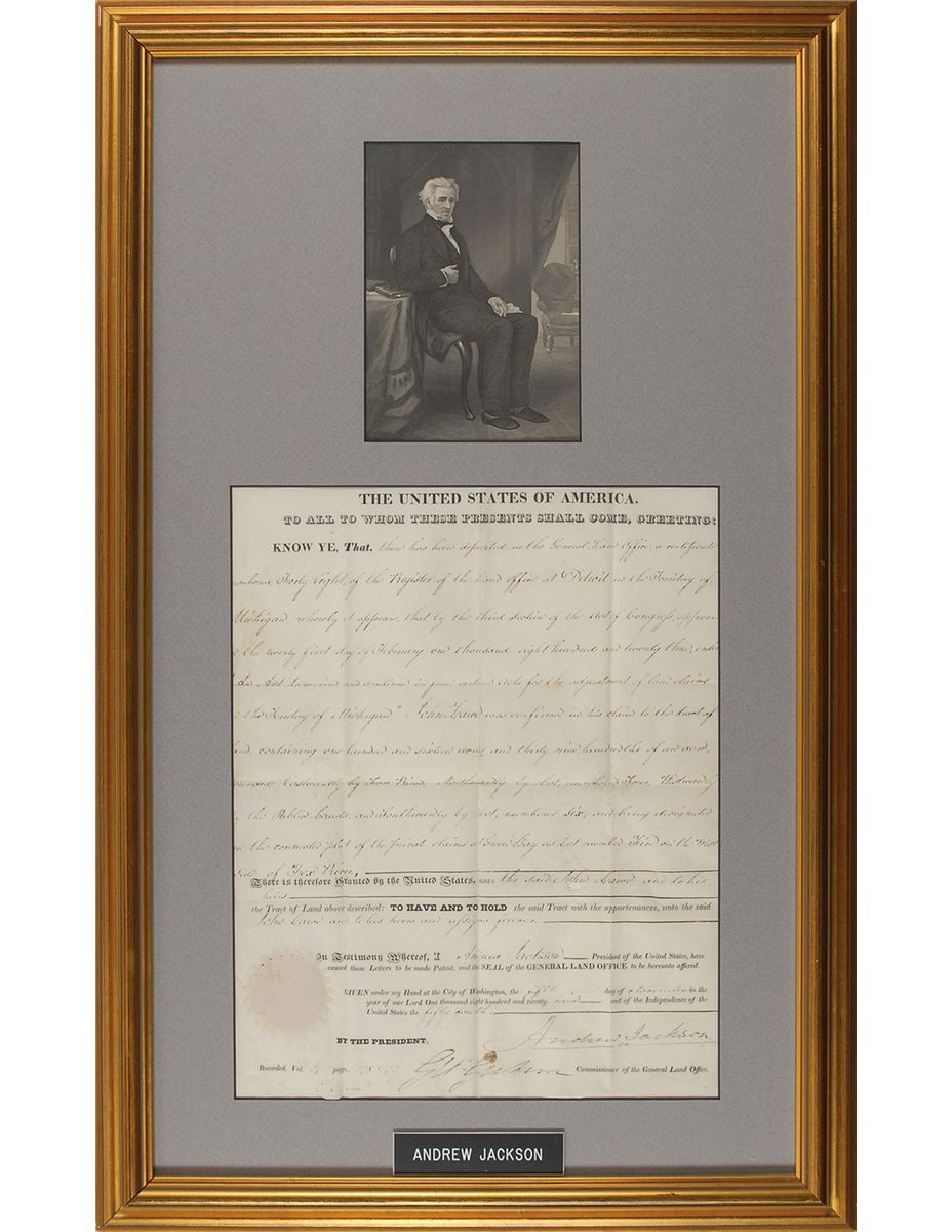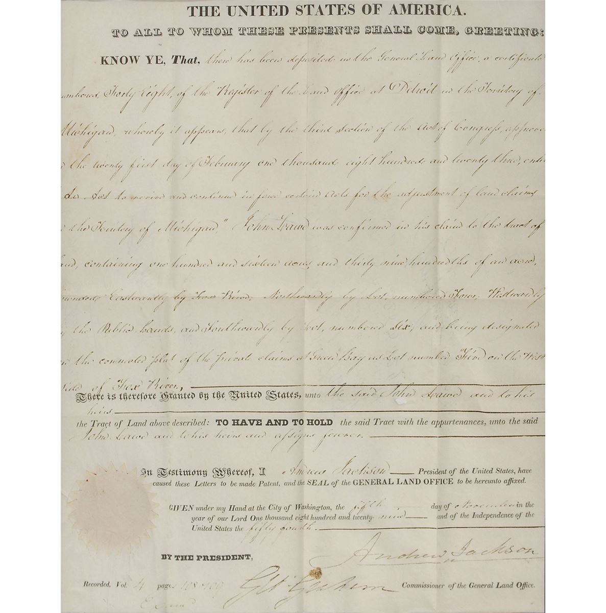 Partly-printed DS as president, signed "Andrew Jackson," one page, 11.25 x 14, November 29, 1829. A document concerning a parcel of land. In part: "There has been deposited in the General Land Office a certificate…of the Register of the Land Office at Detroit in the Territory of Michigan, whereby it appears that…John Lawe was confirmed in his claim to the tract of land, containing one hundred and sixteen acres." Nicely signed at the conclusion by President Jackson and countersigned by Commissioner of the General Land Office George Graham. The white paper seal affixed to the lower left remains crisp and fully intact. Matted and framed with a portrait and nameplate affixed to the glass to an overall size of 18 x 29. In fine condition, with intersecting folds (one vertical fold passing through a single letter of the signature), one small hole to the body of the document, and a spot of soiling just beneath the first letter of Jackson's signature.
