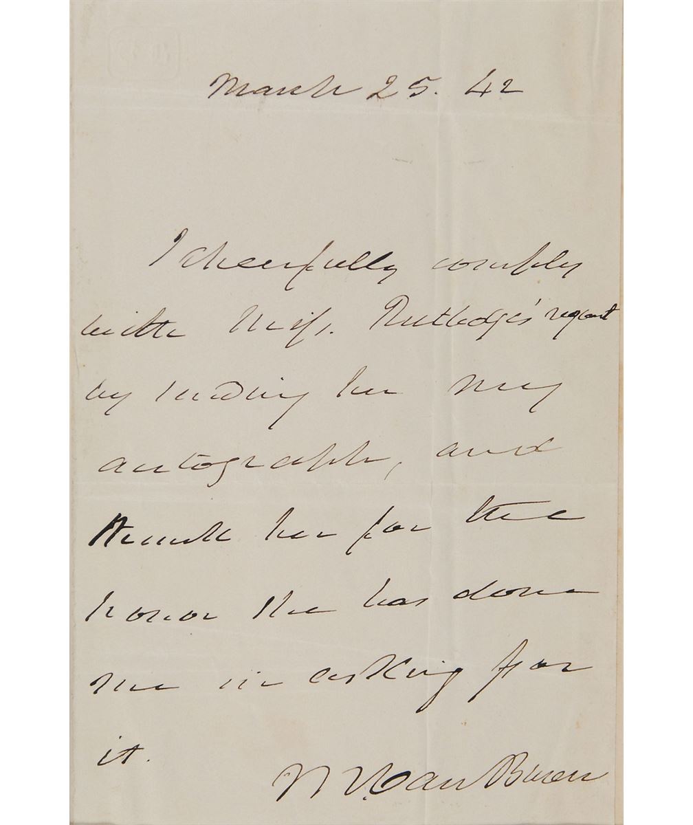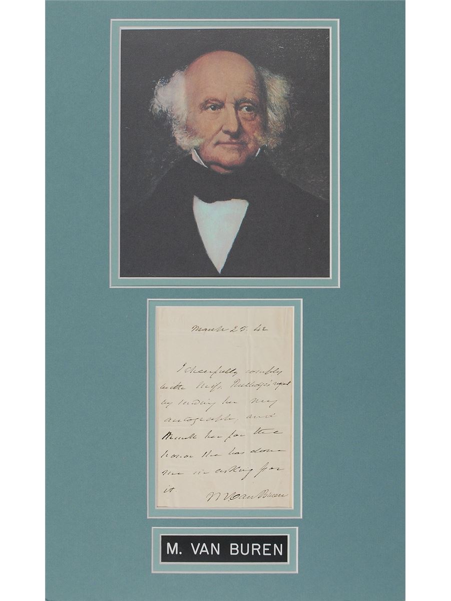 ALS signed "M. Van Buren," one page, 4 x 6, March 25, 1842. In part: "I cheerfully comply with Miss Rutledge’s request by sending her my autograph." Double-matted with a color portrait and nameplate to an overall size of 11 x 18. Intersecting folds (one vertical fold passing through a single letter of the signature) and scattered creases, otherwise fine condition.