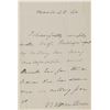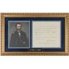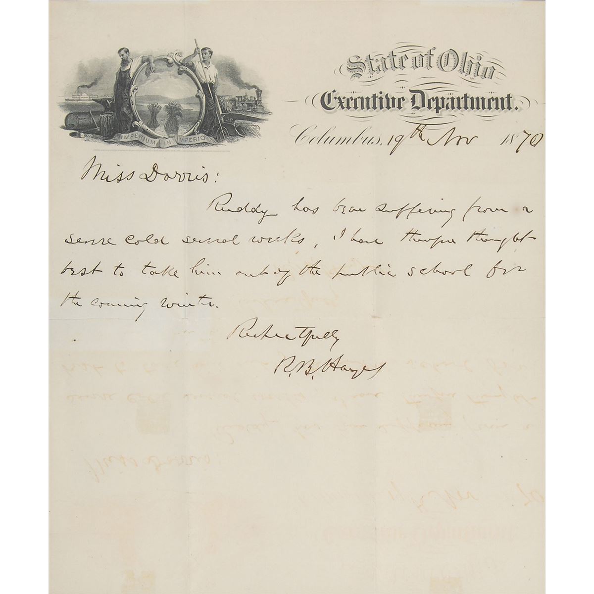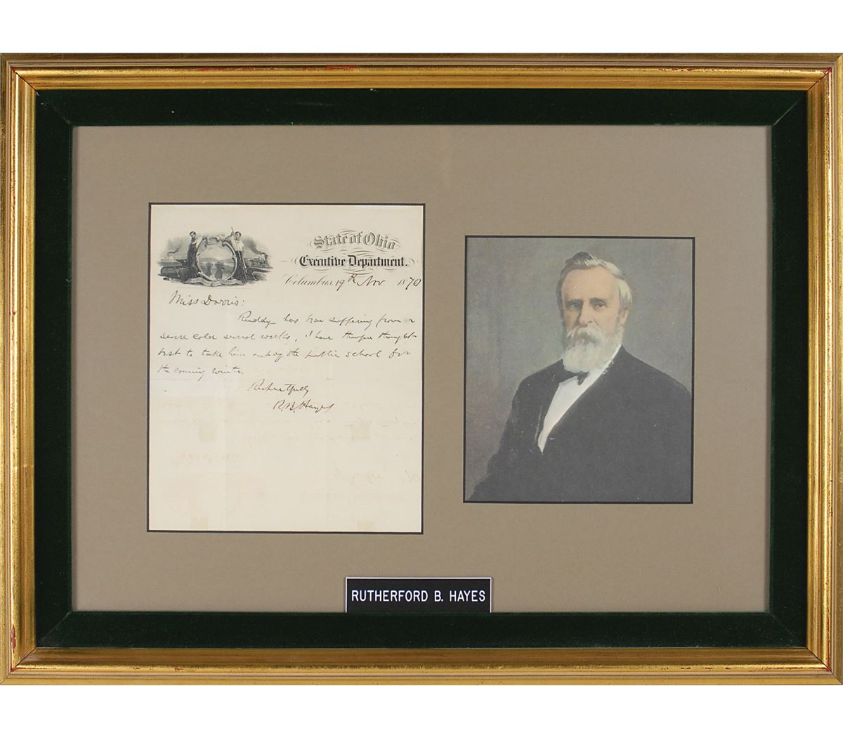 ALS signed "R. B. Hayes," one page, 7.5 x 9, State of Ohio Executive Department letterhead, November 19, 1870. A letter to his son's schoolteacher. In part: "Ruddy has been suffering from a severe cold for several weeks, I have…thought best to take him out of the public school for the coming winter." Double-matted and framed with a color portrait and nameplate affixed to the glass to an overall size of 13.5 x 17.5. In very good condition, with intersecting folds, noticeable mirroring to ink, and small blocks of adhesive remnants to the lower portion. Hayes's son, Rutherford Platt Hayes, would have been 12 years old at the time of this correspondence; he went on to become a librarian.