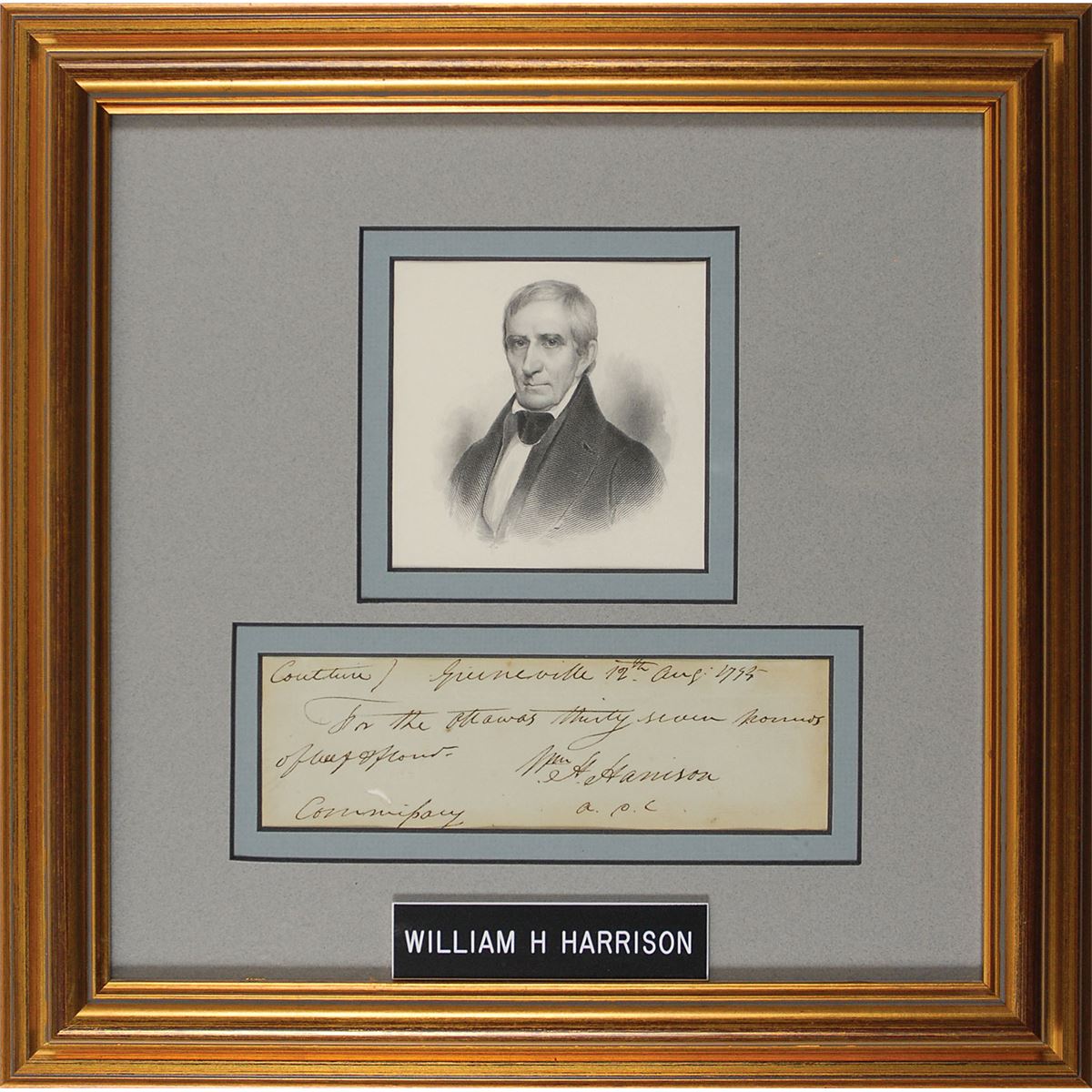 ADS signed "Wm. H. Harrison," one page, 7 x 2, August 12, 1795. A requisition order issued from Greeneville. In full: "For the Ottawas thirty seven pounds of beef & flour." Double-matted and framed with an engraved portrait and nameplate affixed to the glass to an overall size of 14 x 14. In fine condition, with toning to edges and a small hole to the lower left.