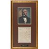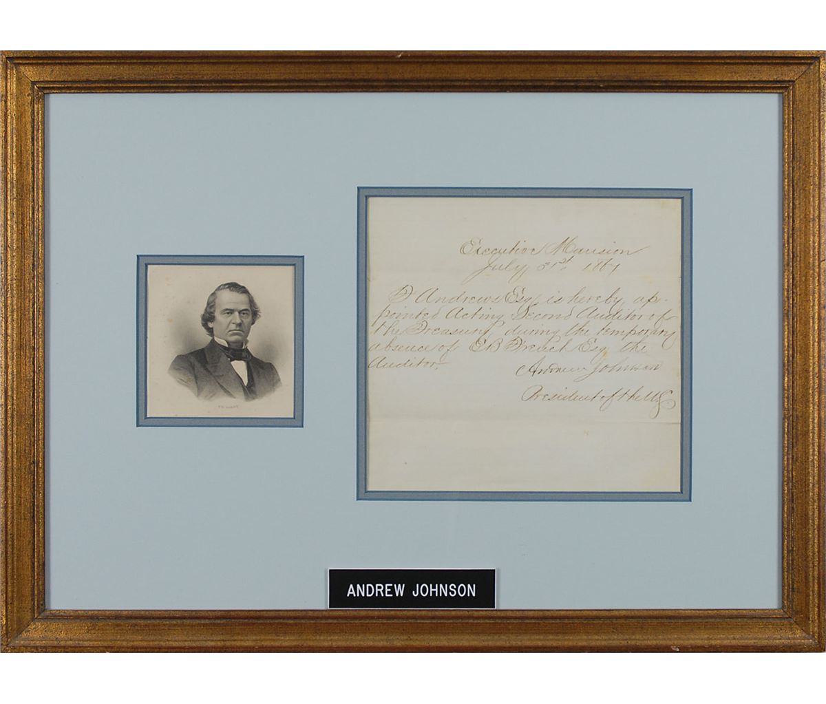 Manuscript DS as president, signed "Andrew Johnson," one page, 7.5 x 7, July 31, 1867. In full: "F. Andrews Esq is hereby appointed Acting Second Auditor of the Treasury, during the temporary absence of E. B. French Esq the Auditor." Double-matted and framed with an engraved portrait and nameplate affixed to the glass to an overall size of 19.5 x 14.25. Intersecting folds with one small edge separation and light scattered soiling, otherwise fine condition.