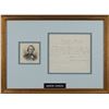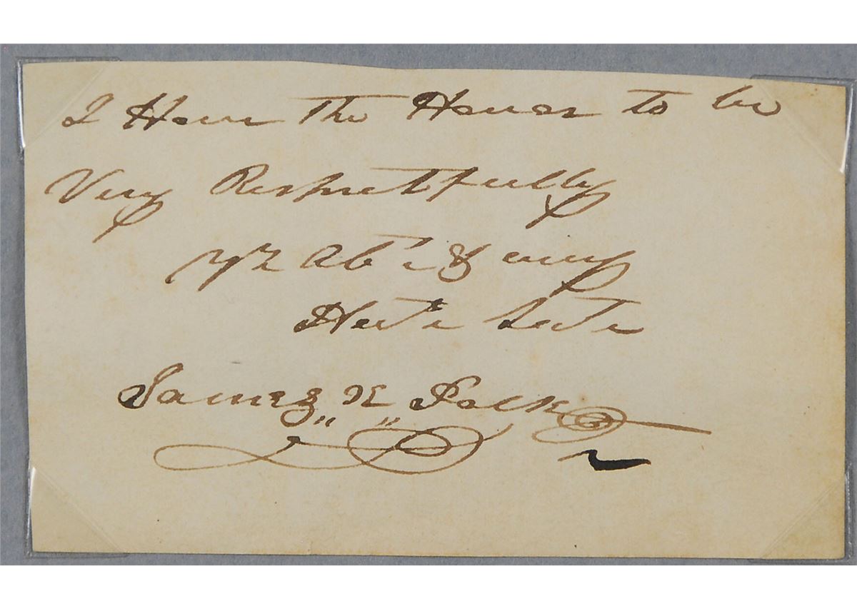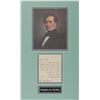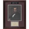 Elaborate ink signature, "I Have the Honor to be, Very Respectfully, yr obt & very Hmbl Servt, James K. Polk," clipped from the close of a letter. Double-matted and framed with a color portrait and nameplate affixed to the glass to an overall size of 11.5 x 14.5. In fine condition, with overall toning.