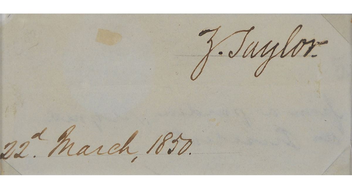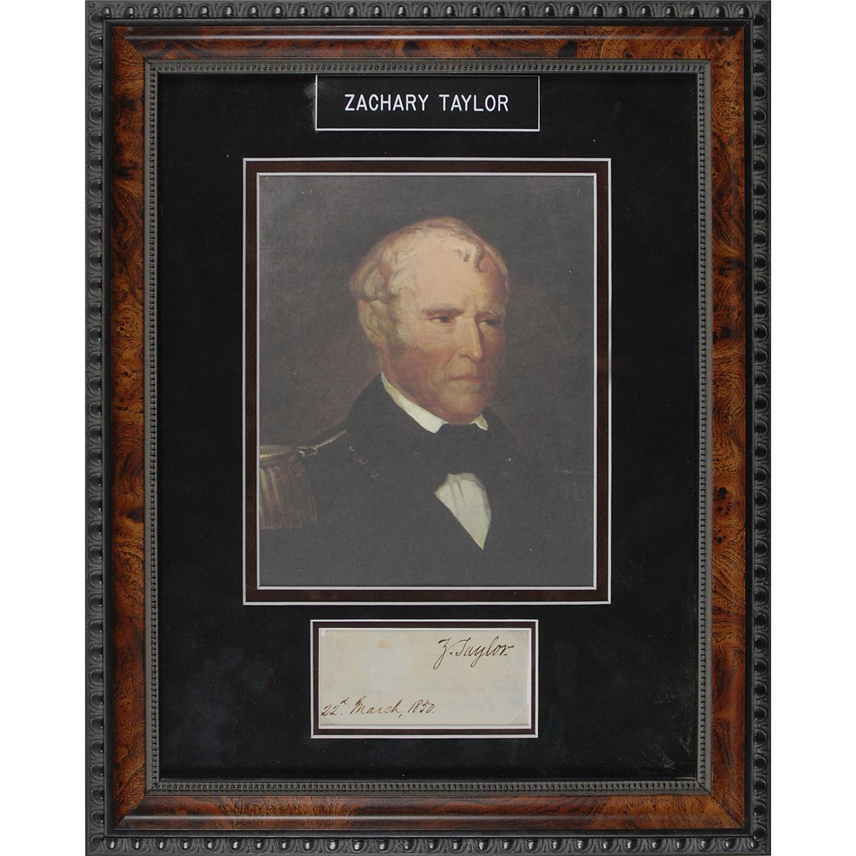 Ink signature as president, "Z. Taylor," on an off-white 3.75 x 1.75 slip dated March 22, 1850. Double-matted and framed with a color portrait and nameplate affixed to the glass to an overall size of 12 x 15. In fine condition, with a few light spots of adhesive, mild toning, and slight show-through from writing to reverse.