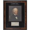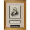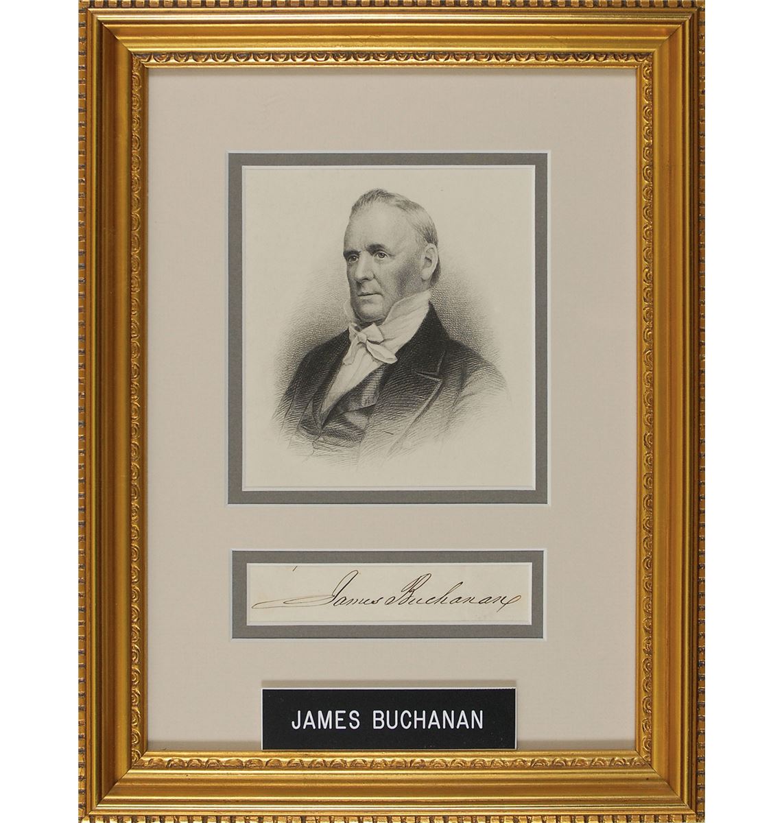 Crisp ink signature, "James Buchanan," on an off-white slip clipped from a larger document. Double-matted and framed with an engraved portrait and nameplate affixed to the glass to an overall size of 9.75 x 12.75. In fine condition, with light soiling.