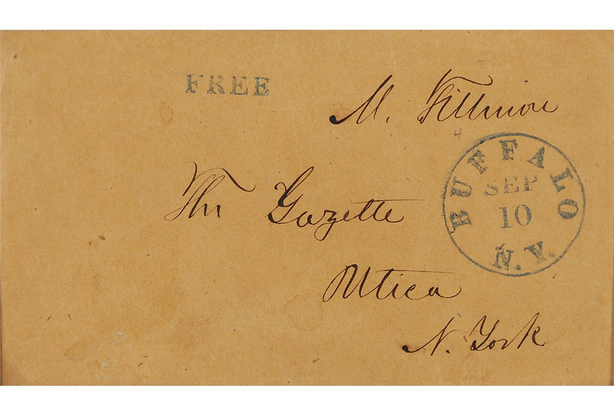 Hand-addressed free-franked envelope, 5.25 x 3, addressed by Fillmore to “The Gazette, Attica, New York,” and franked in the upper right, “M. Fillmore,” next to a “Free” stamp. Envelope also bears a September 10, Buffalo, New York, postal cancellation. Double-matted with a color portrait and nameplate to an overall size of 11 x 18. Moderate overall toning and light soiling, otherwise fine condition.