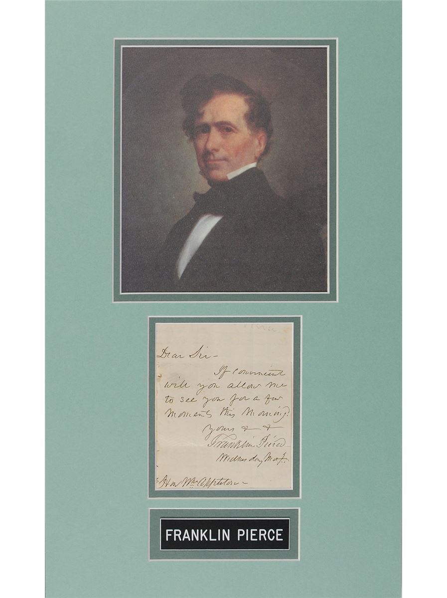 ALS signed "Franklin Pierce," one page, 4 x 5, no date. Letter to "Hon. Mr. Appleton." In full: “If convenient will you allow me to see you for a few moments this morning?” Double-matted with a color portrait and nameplate to an overall size of 11 x 18. Intersecting folds (one vertical fold passing through a single letter of the signature), a rough left edge, and show-through from writing in another hand on the reverse.