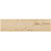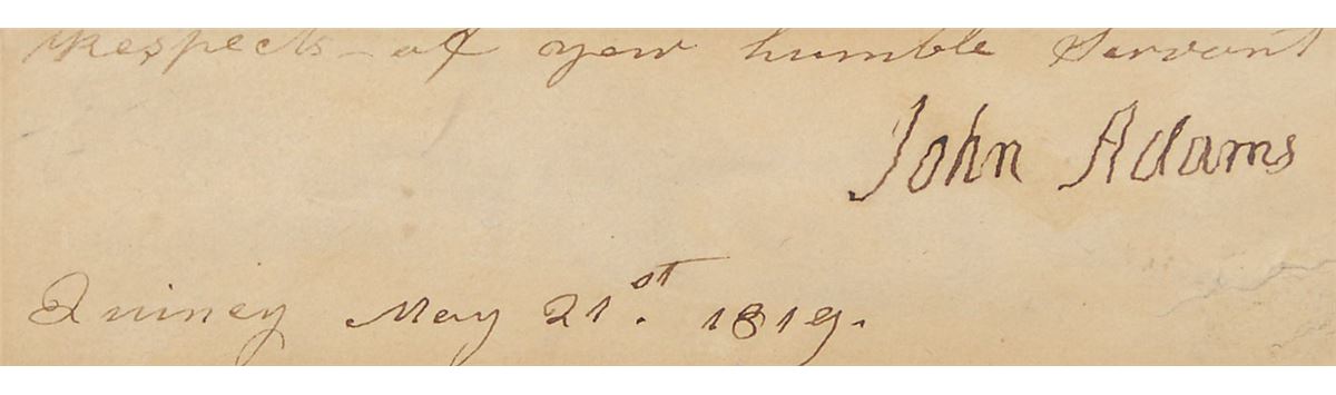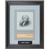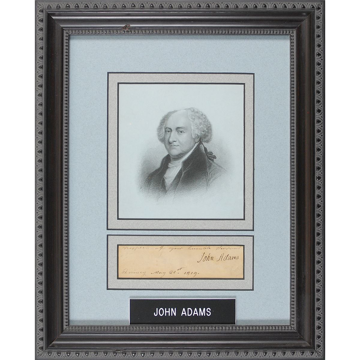 Crisp ink signature, "John Adams," on an off-white 4.5 x 1 slip clipped from the close of a letter, dated May 21, 1819. Double-matted and framed with an engraved portrait and nameplate affixed to the glass to an overall size of 10.75 x 13.25. In fine condition, with overall toning and a small tear to the lower right. A choice, crisp signature of the scarce Founding Father.