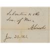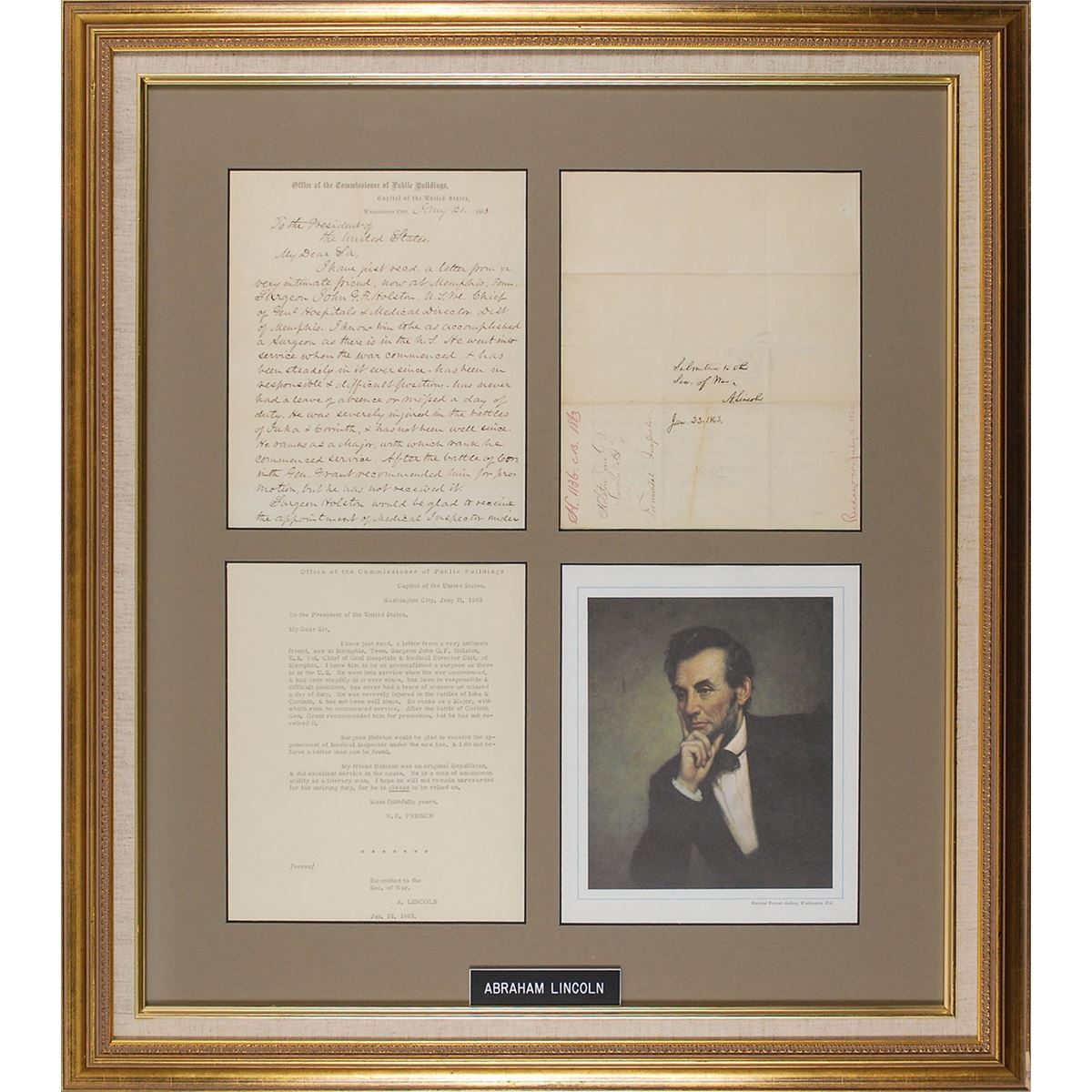 Bold handwritten and signed endorsement as president, "Submitted to the Secretary of War, A. Lincoln, Jan. 23, 1863," penned on the reverse of a letter sent to him by Benjamin Brown French, two pages, 7.75 x 9.5, Office of the Commissioner of Public Buildings letterhead, January 21, 1863. French's letter, in part: "I have just recd. a letter from a very intimate friend, now at Memphis, Tenn. Surgeon John G. F. Holston…I know him to be as accomplished a surgeon as there is in the U. S. He went into service when the war commenced…has been in responsible & difficult positions, has never had a leave of absence or missed a day of duty. He was severely injured in the battles of Iuka & Corinth, & has not been well since…After the battle of Corinth Gen. Grant recommended him for promotion, but he has not received it. Surgeon Holston would be glad to receive the appointment of Medical inspector…I do not believe a better man can be found…My friend Holston was an original Republican, & did excellent service in the cause…I hope he will not remain unrewarded for his untiring duty, for he is always to be relied on." Matted and framed with a color portrait, transcript, and nameplate affixed to the glass to an overall size of 25.75 x 29. In fine condition, with intersecting folds and light toning (a line of toning through the date in Lincoln's endorsement).