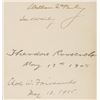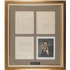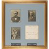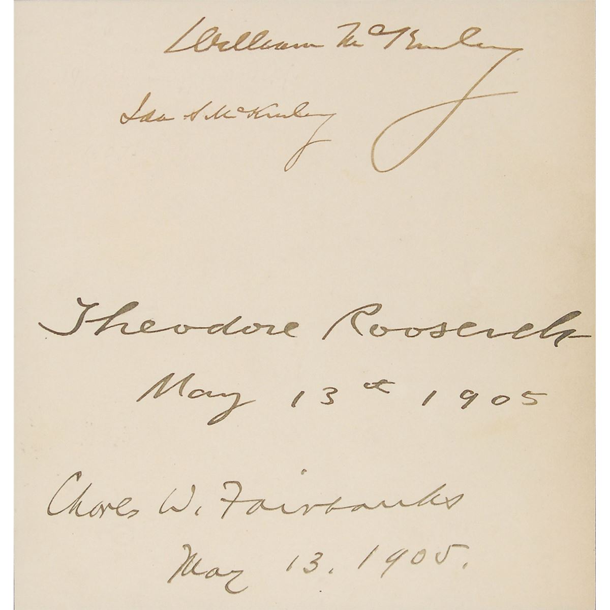 Fantastic set of ink signatures, "William McKinley," "Ida McKinley," "Theodore Roosevelt, May 13th 1905," and "Charles W. Fairbanks, May 13, 1905," on an off-white 5.5 x 5.75 sheet. Double-matted and framed with three portraits and nameplates affixed to the glass to an overall size of 19 x 20. In fine condition. The McKinleys would have signed this much earlier than Roosevelt and Fairbanks; Roosevelt was McKinley's vice president, and ascended to the presidency with McKinley's assassination in 1901. Fairbanks became Roosevelt's vice president beginning in 1905.
