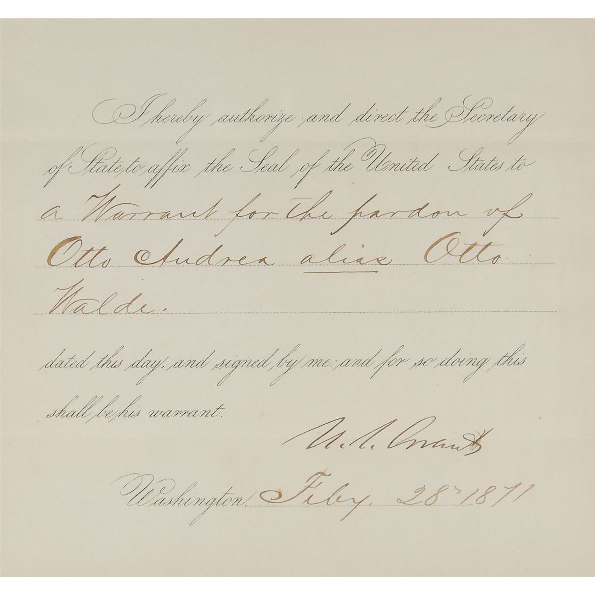 Partly-printed DS as president, signed "U. S. Grant," one page, February 28, 1871. President Grant directs the "Secretary of State to affix the Seal of the United States to a Warrant for the pardon of Otto Andrea alias Otto Walde." Double-matted and framed with a color portrait and nameplate affixed to the glass to an overall size of 19 x 12. In fine condition, with a horizontal fold passing through the signature.