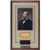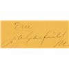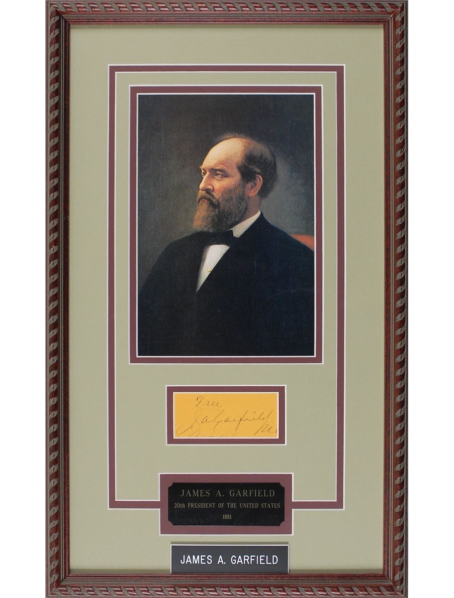 Ink free franking signature, "Free, J. A. Garfield, MC," on a beige 3.5 x 1.25 slip clipped from an address panel. Double-matted and framed with a color portrait and nameplate affixed to the glass to an overall size of 12.5 x 20.5. In fine condition.