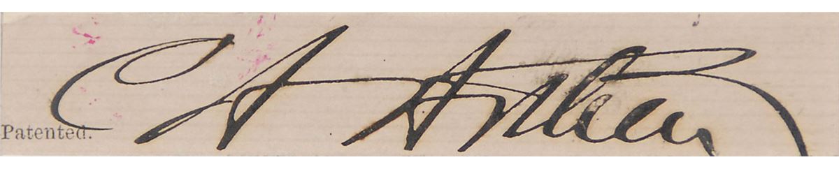 Bold ink signature, “C. A. Arthur,” on an off-white slip clipped from a larger document. Double-matted and framed with an engraved portrait and nameplate affixed to the glass to an overall size of 9.25 x 11. In fine condition, with light brushing to his last name.