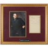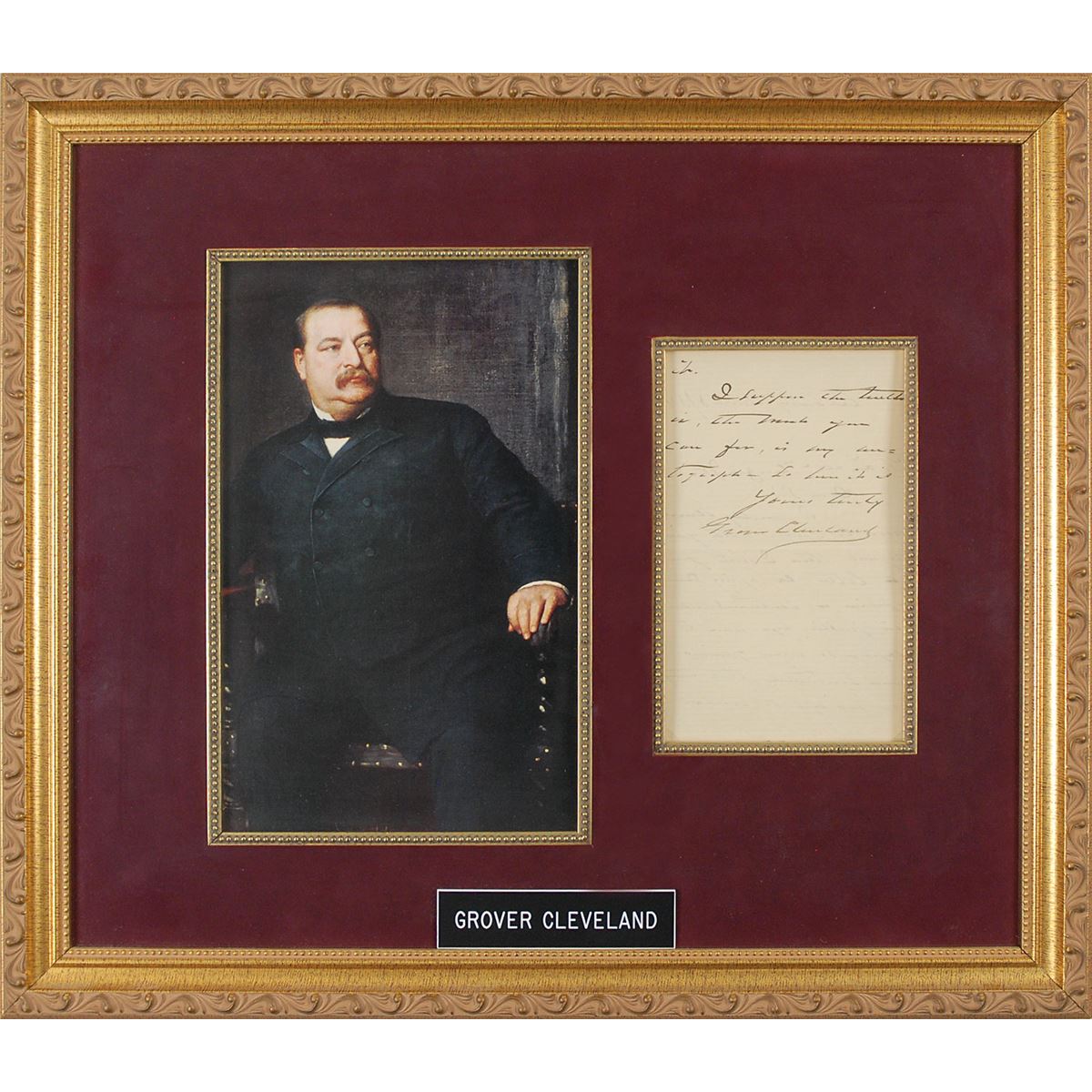ALS signed "Grover Cleveland," one page both sides, 4 x 6.5, March 8, 1884. In full: "I hardly know how to comply with your request that I write you a letter expressing some opinion or sentiment. Men in public life have to express so many opinions and sentiments that they are not apt to do so when they can avoid it. I suppose the truth is, the most you came for is my autograph—So here it is." Double-matted and framed with a portrait and nameplate affixed to the glass to an overall size of 18.5 x 16, with a window on the reverse for viewing the first portion of the letter. In fine condition, with show-through from writing to opposing sides.