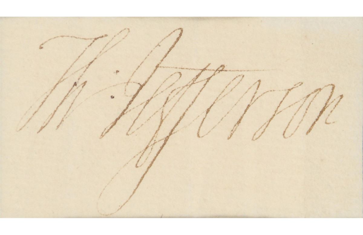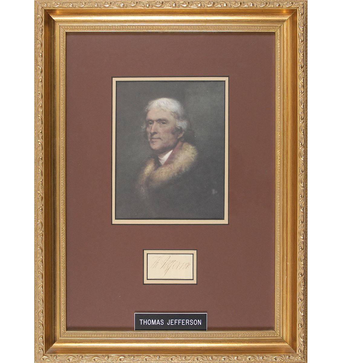 Superlative ink signature, "Th: Jefferson," on an off-white 2.5 x 1.25 slip. Double-matted and framed with a color portrait and nameplate affixed to the glass to an overall size of 15 x 20. In fine condition. An absolutely magnificent example in all respects.