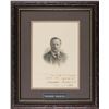 Handsome engraved portrait of Roosevelt, 7.25 x 10.5, signed and inscribed in ink as president, "To Mrs. Janie H. Rupert, with the regards of Theodore Roosevelt, Feb 18th 1909." Double-matted and framed with a nameplate affixed to the glass to an overall size of 14.5 x 18. In very good condition, with scattered foxing and some light brushing and feathering to the signature.