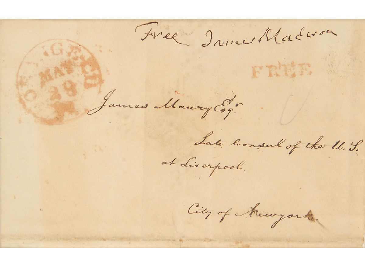 Free-franked mailing envelope panel, 5 x 3.25, addressed in another hand to "James Maury Esqr, Late Consul of the U. S. at Liverpool, City of New York," and franked in the upper right, "Free, James Madison." The panel is postmarked May 29 and bears a ‘Free’ ink stamp. Includes the original monogrammed red wax seal clipped from the cover, impressed with Madison's initials, "JM," and an engraving of Madison bearing a facsimile signature. Matted and framed together with a nameplate affixed to the glass to an overall size of 15.25 x 19.75. Scattered creases, toning, and soiling, otherwise fine condition.