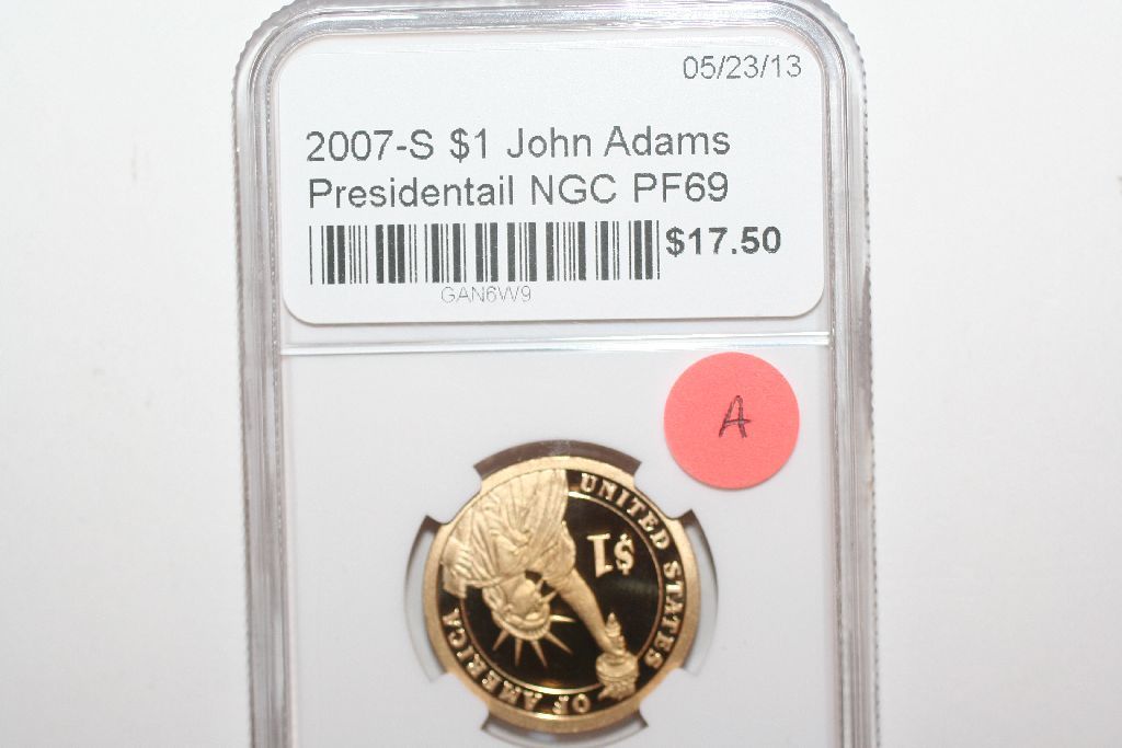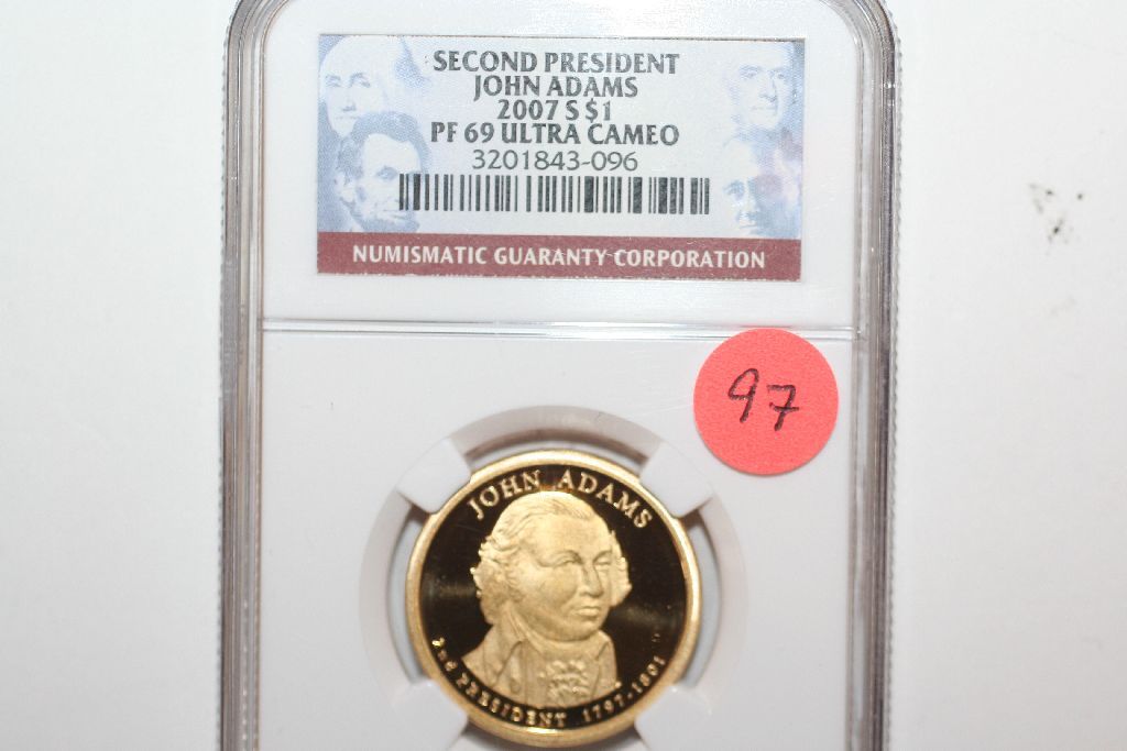 This lot is an ngc graded 2007-s john adams presidential $1 coin; Pf-69