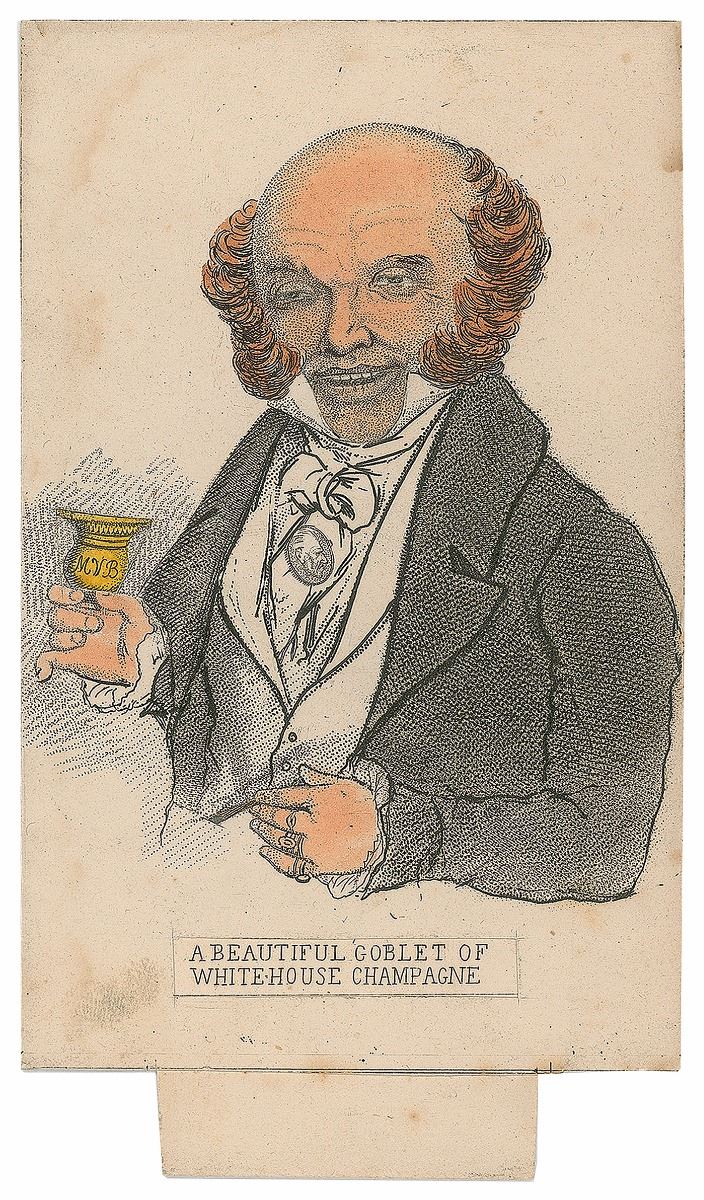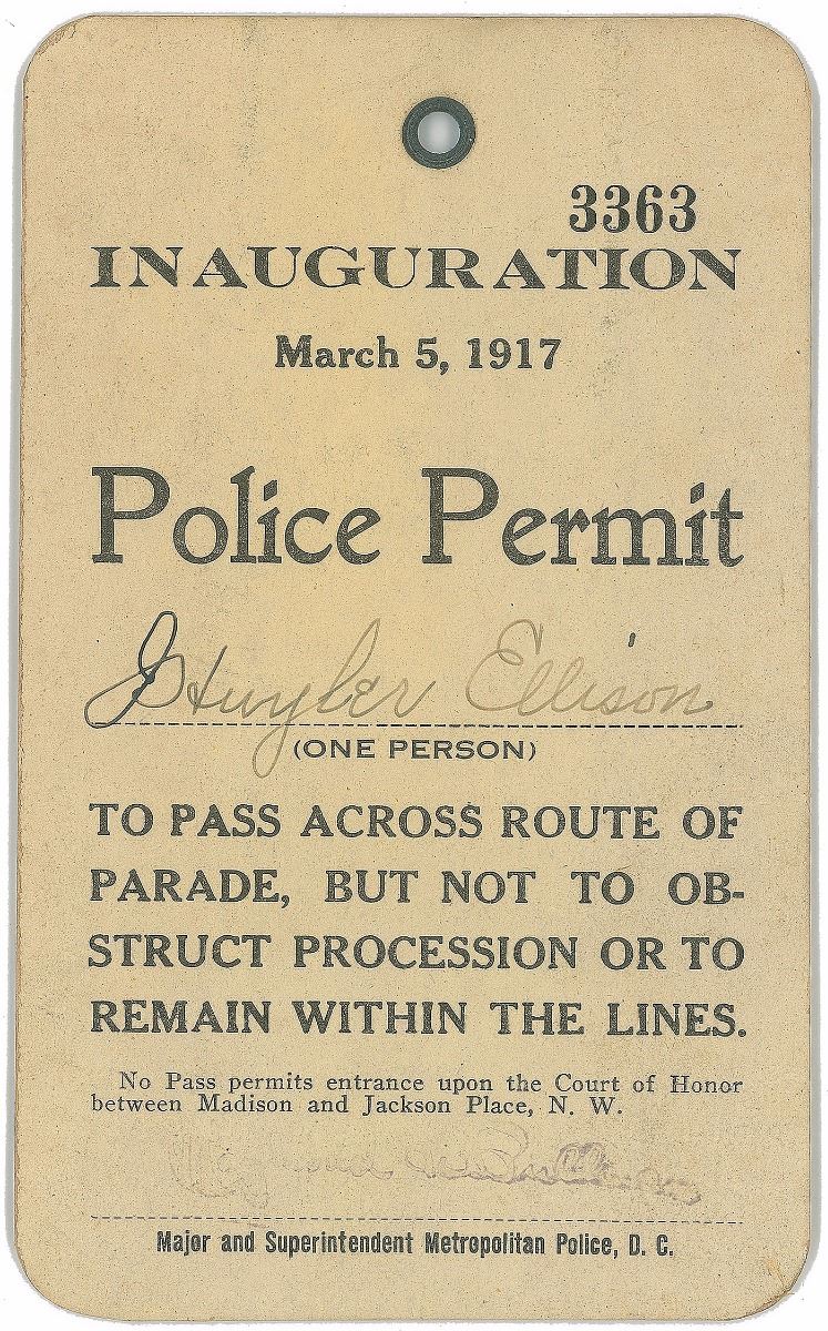 Eight unsigned items: a humorous pull-tab caricature card depicting Van Buren, showing him with either “A beautiful goblet of White House Champagne” or “An ugly mug of log-cabin hard cider”; a partly-printed invitation filled out in another hand, inviting a couple to a dinner with the president; three tickets to the 1920 Democratic National Convention (one unused); a police permit to pass across Woodrow Wilson’s inauguration parade route of on March 5, 1917; a ticket to the Garrick Theatre for a presidential campaign event on April 6, 1912; and a partly-printed invitation filled out in another hand, February 7, 1911, in part: “The President and Mrs. Taft request the pleasure of the company of Mr. and Mrs. Popper at a reception to be held at the White House.” Includes an admission card, small envelope marked “Not Transferable,” and White House transmittal envelope. In overall fine condition.