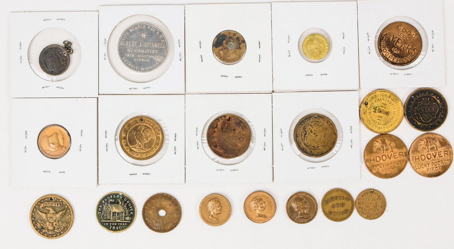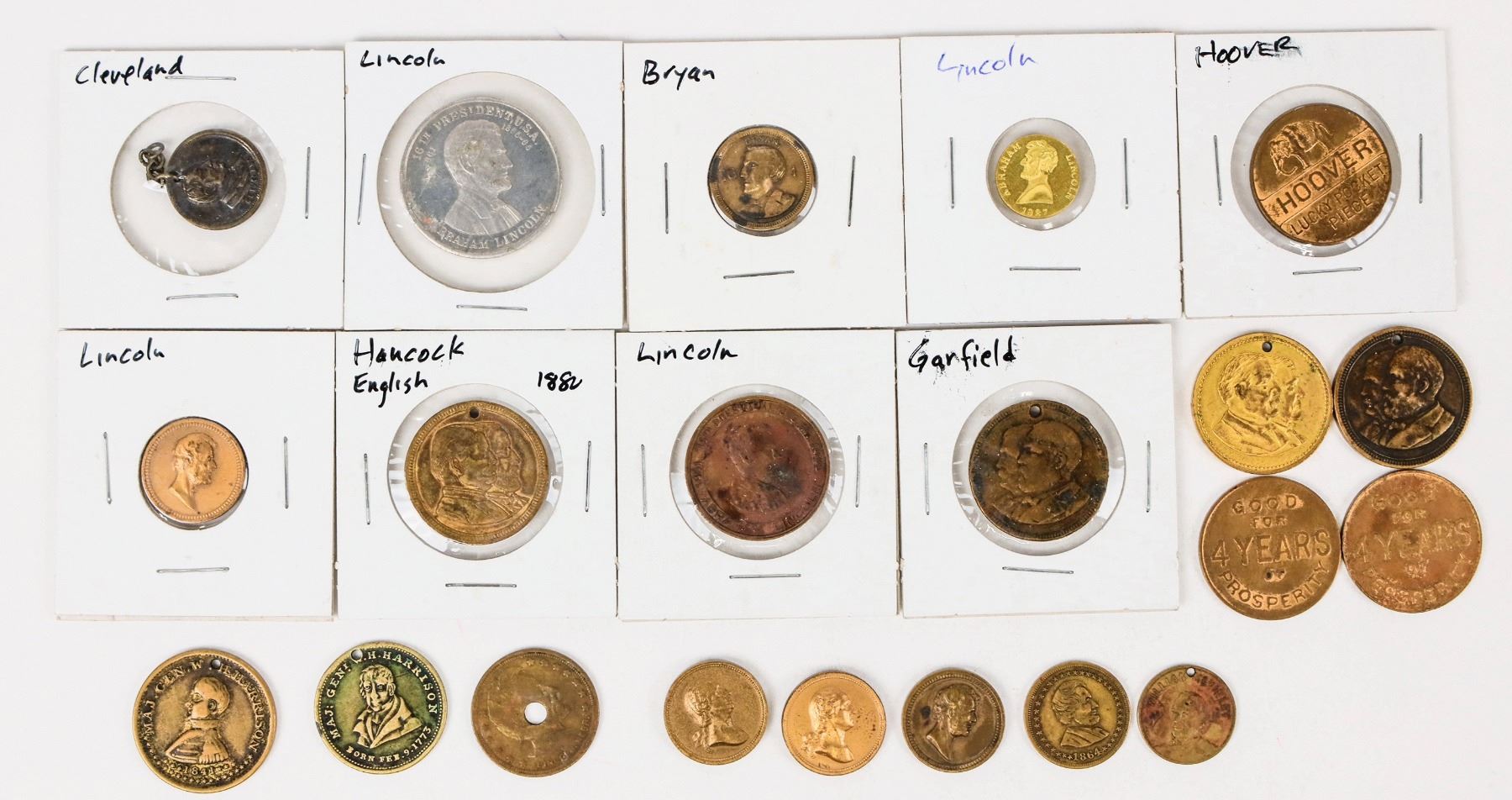 Varieties of 22 presidential and political medals and tokens. Presidential: Lincoln (9); Cleveland (2); McKinley; W. H. Harrison (2); Garfield (2); Hoover (3). Political: William Jennings Bryan; Blaine/Logan (lost to Grover Cleveland); W. S. Hancock/W. H. English (lost to James A. Garfield 1880).