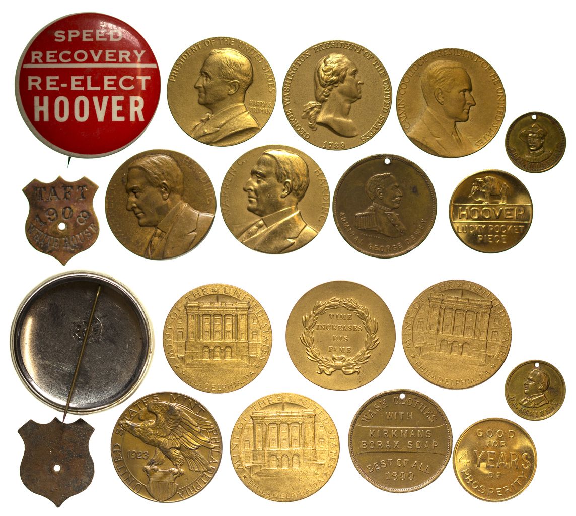 Lot of 10 token medallions of various Presidents, including Hoover, Taft, Washington, Harding, Truman and McKinley. Tokens are various sizes and metal compositions, including (1) Hoover Button. Weber collection.
