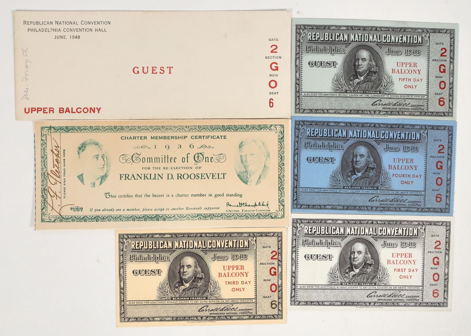 Republican National Convention guest tickets. In very appealing condition with good saturation, crisp corners, and nicely torn perforated edge, 4 tickets with single envelope, c1948. Includes a charter membership certificate for re-election of Franklin D. Roosevelt pasted onto backing, c1936. Tickets measure about 5x2.75" and certificate measures about 7x3". All pieces are in very appealing condition, see photo.