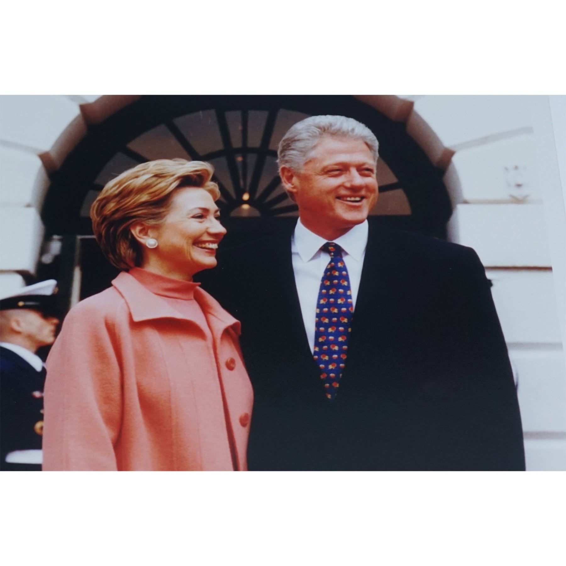 A high-quality printed photograph capturing former U.S. President Bill Clinton and former First Lady Hillary Clinton in an official setting. The image shows them standing together outside a formal government building, with security personnel visible in the background. Bill Clinton is dressed in a dark suit with a patterned tie, while Hillary Clinton is elegantly attired in a rose-colored coat. The photograph reflects a moment of warmth and unity, emblematic of their time in the White House. This piece is a striking addition for collectors of presidential memorabilia, political history, and photography enthusiasts.