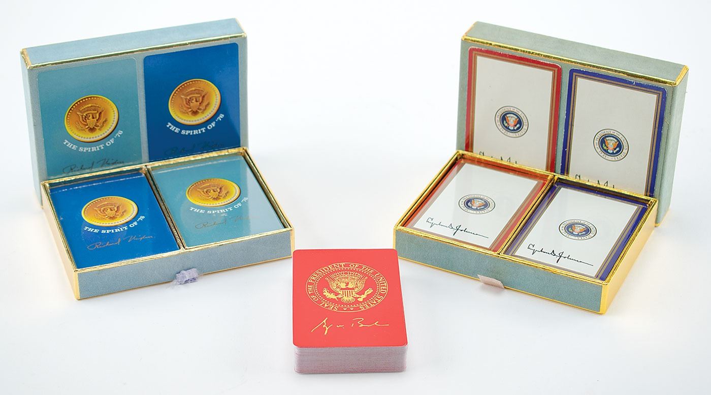 Three sets of presidential playing cards: a pair of two decks featuring the presidential seal and Lyndon B. Johnson's facsimile signature, housed in their original green velvet box; a pair of two decks featuring the presidential seal, "The Spirit of '76," and Richard Nixon's facsimile signature, housed in their original box; and a deck of red playing cards gilt-stamped with the presidential seal and George W. Bush's facsimile signature, in its original box. The Johnson and Nixon decks are sealed in their original plastic, and the Bush deck is unused. In overall fine condition.