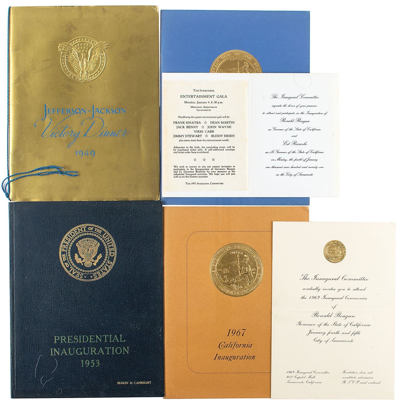 Collection of four programs associated with presidents, including: Harry S. Truman (1949 Jefferson-Jackson Victory Dinner); Dwight D. Eisenhower (1953 inauguration as president); Ronald Reagan (1967 and 1971 inaugurations as governor of California, both with invitations). In overall very good to fine condition, with some scattered creasing and staining.