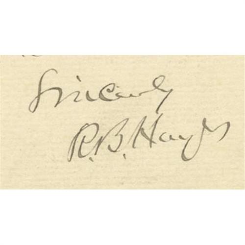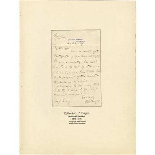 <B>Presidential Rutherford B. Hayes Autograph Letter Signed to Photographer James Landy</B></I> A.L.S. <I>"R.B. Hayes"</B></I> on Executive Mansion letterhead marked <I>"Private"</B></I> at top, 1p., 4.5" x 7", Washington , Oct. 21, 1879, thanking photographer James Landy for photographs received. In part: <I>"I am in receipt of the photographs of Gen. </B></I> James M. <I>Comly and myself. They are capital. The full length is the best of that size which has ever been taken. This is the judgment of those competent to speak on the subject…"</B></I> Nice association letter linking Hayes to Gen. Comly, who was instrumental in advancing Hayes' political career. Light soiling, otherwise very good. Tipped to a larger sheet and accompanied by an engraving of Hayes.<BR><BR><b>Shipping:</b> Flat Material, Small (<a target="_blank" href="http://www.heritageauctions.com/common/shipping.php">view shipping information</a>)