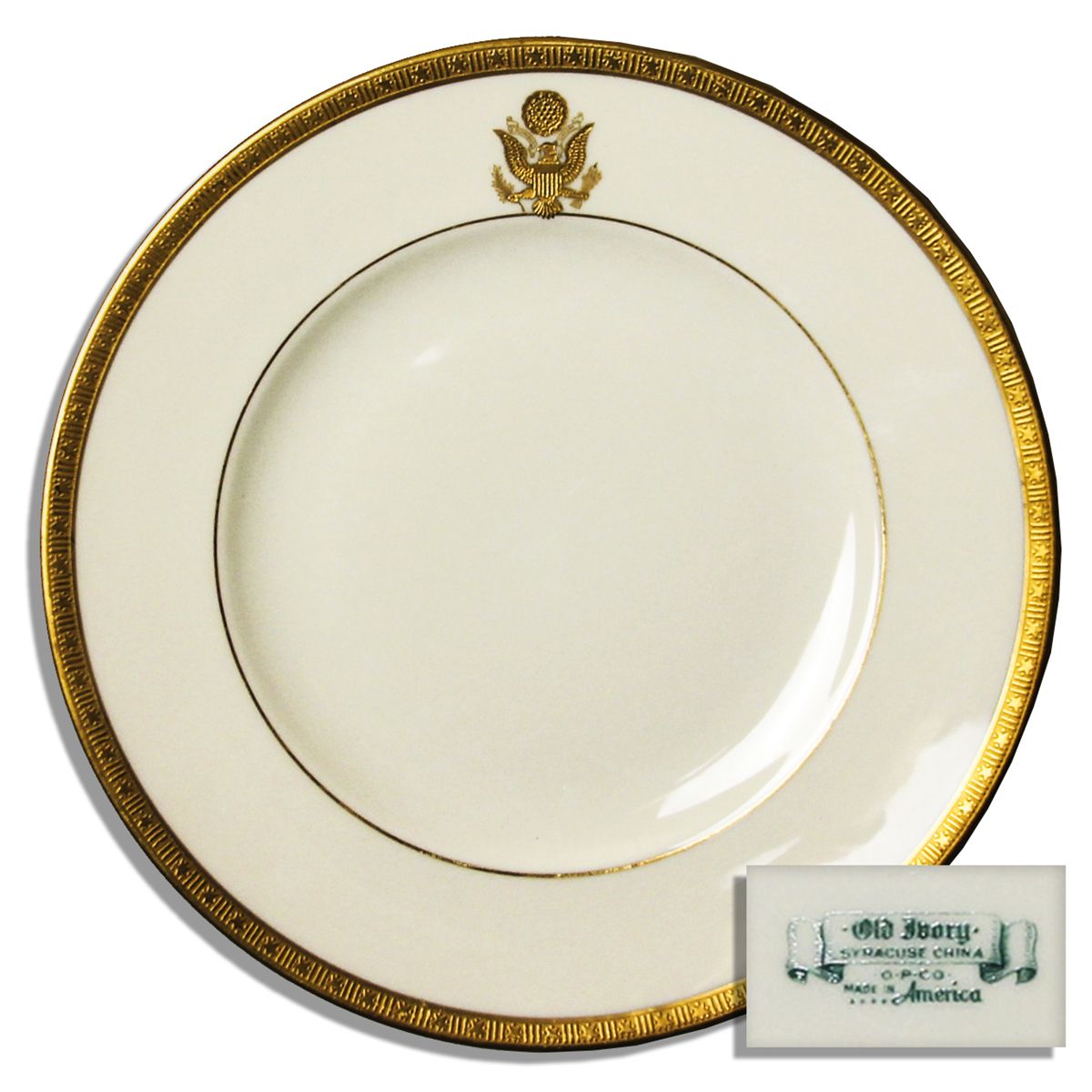 Presidential travel china plate by Syracuse, designed in a modified version of the classic Wilson pattern originated by Lenox in 1918. A tasteful and timeless design, it was reordered in the White House by Harding, Coolidge and Hoover. Travel salad plate of ivory china features an alternating star and 3-bar design on the rim and a gilt presidential eagle at 12 o'clock. Eagle differs from the Lenox version with a solid gilt emblem over its head containing 13 embossed stars representing the 13 original colonies. Plate bears the ''Old Ivory / Syracuse China / OPCO / Made in America'' stamp to verso; style of stamp dates from 1927-1960. Syracuse was the industry leader in china for train dining cars, restaurants, hotels and other industrial institutions. Plate was likely used in the dining/conference room on the Ferdinand Magellan, the presidential rail car custom rebuilt in 1942 by the Pullman Company for use by Franklin D. Roosevelt and subsequent presidents through Dwight D. Eisenhower. Plate measures just under 9'' in diameter. The face is near fine; verso shows adhesive residue, a felt tip mark and three miniscule chips, else near fine overall.