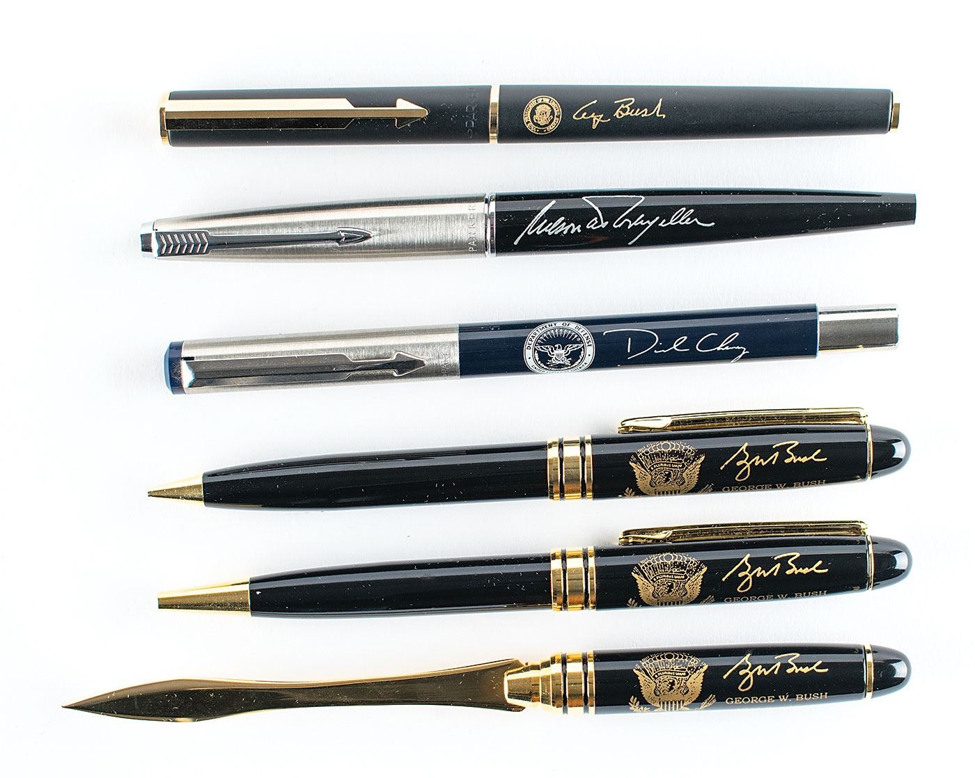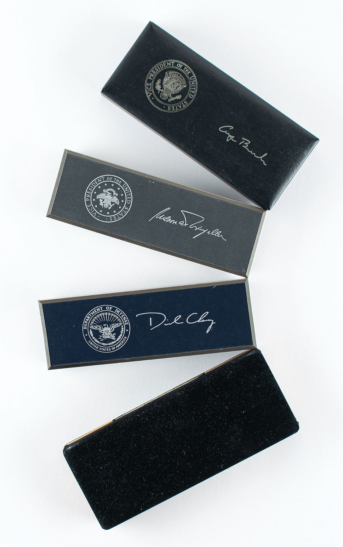 Group of four boxed sets of White House gift pens associated with presidents and vice presidents, all with their facsimile signatures on the bodies or boxes, including: Vice President Nelson A. Rockefeller (Parker felt tip pen); Vice President George Bush (Parker ballpoint pen); Secretary of Defense Dick Cheney (Parker ballpoint pen); and President George W. Bush (ballpoint pen, pencil, and letter opener). In overall fine condition.