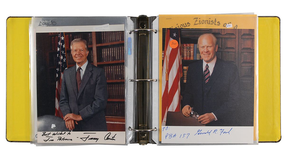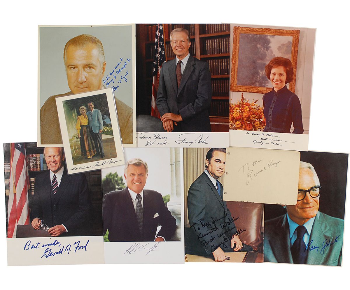 Collection of approximately 60 items comprised of signed photos, letters, and cards, each signed by a notable presidential-related figure or candidate, including: Ronald Reagan, Richard Nixon, Gerald Ford, Jimmy Carter, Ted Kennedy, George McGovern, Rosalyn Carter, Spiro Agnew, George Wallace, Dan Quayle, Al Gore, and Barry Goldwater. In overall very good to fine condition. The volume of items precludes a complete list, and interested parties are advised to view the collection in person at our offices, as this collection is sold as is, and no returns will be accepted.
