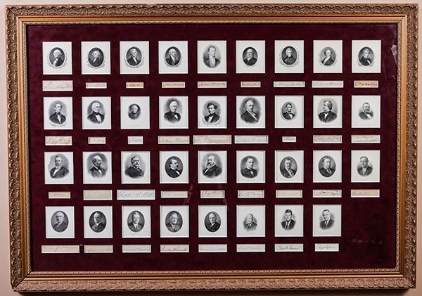 [presidents] George Washington Through Lyndon B. Johnson. Thirty-five Signatures of the first 36 Presidents of the United States, most cut from documents. Since Grover Cleveland was the 22nd and 24th President, there is only one signature for him. Garfield's and Eisenhower's signatures are somewhat light. The signatures are matted with 3¼ x 3" steel engravings of each President above his signature, all of which are handsomely framed to an overall size of 30½ x 43½". These signatures cover U.S. presidential history from 1789 through 1969: 181 years. A wonderful display piece.